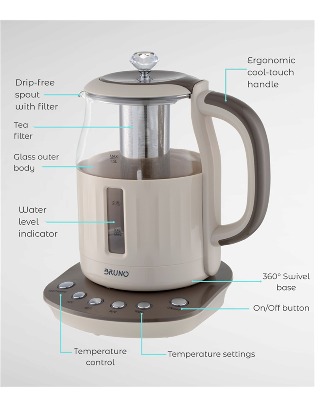 Ηλεκτρικός βραστήρας εξαιρετικής απόδοσης της BRUNO με ισχύ 2200W και χωρητικότητα 1,5 lt. Διαθέτει 4 επίπεδα ρύθμισης θερμοκρασίας, με λειτουργία διατήρησης της θερμοκρασίας αλλά και σύστημα ασφαλείας κατά του βρασμού χωρίς νερό. Επιπλέον είναι εξοπλισμένος με φίλτρο για τσάι ή άλλα ροφήματα.