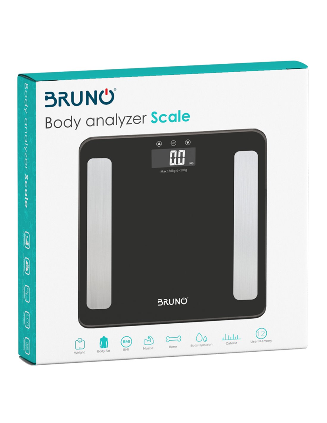 Ψηφιακή ζυγαριά της Bruno με επιφάνεια κατασκευασμένη από tempered glass και μεγάλη ευανάγνωστη οθόνη LCD. Μπορεί να υπολογίσει με εξαιρετική ακρίβεια το σωματικό βάρος, το λίπος, το νερό, την μυϊκή μάζα, την οστική μάζα, τις θερμίδες αλλά και τον Δείκτη Μάζας Σώματος (ΒΜΙ). Διαθέτει 3 μονάδες μέτρησης (kg, lb, st) με δυνατότητα μέτρησης έως 180kg και ευαισθησία 0.1kg για ακριβής μέτρηση του σωματικού βάρους.
