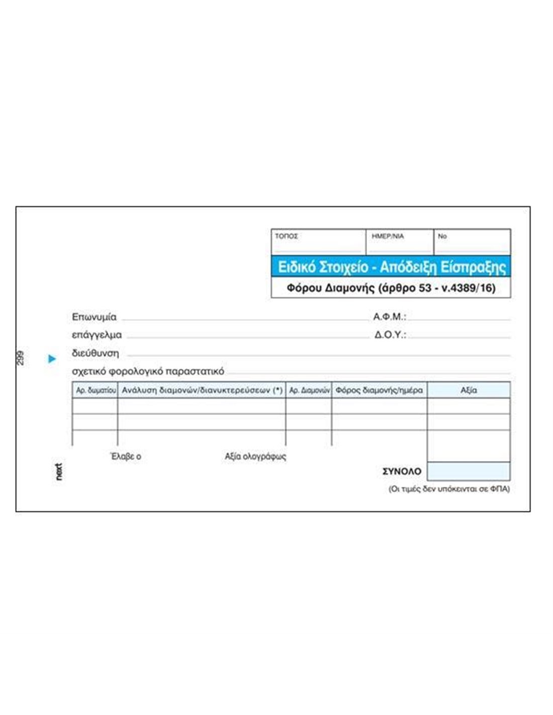 Απόδειξη φόρου διαμονής (Άρθρο 53 ν.4389/16).