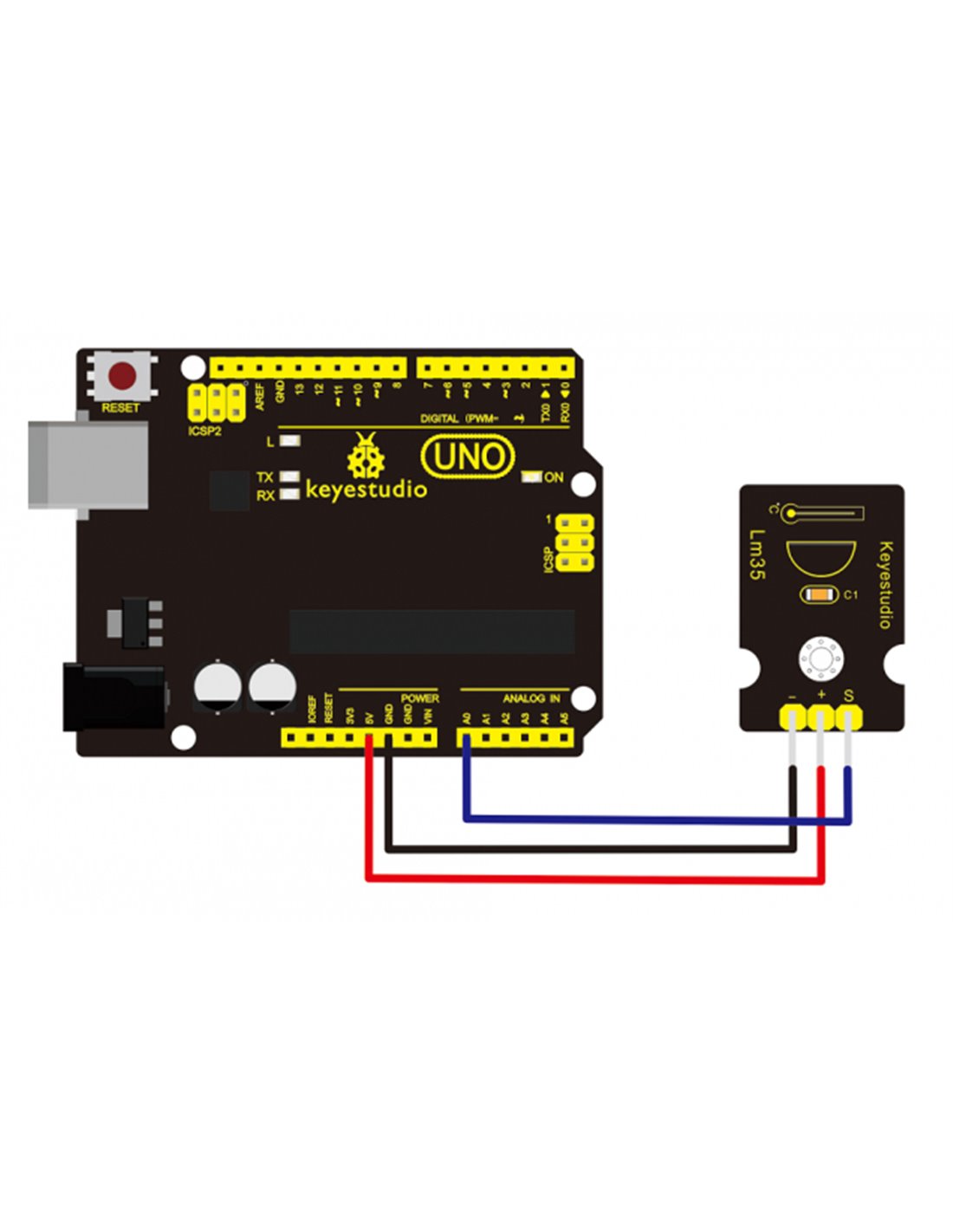 LM35 linear temperature sensor της Keyestudio για Arduino. Μπορεί να χρησιμοποιηθεί για την ανίχνευση της θερμοκρασίας του αέρα του περιβάλλοντος. Προσφέρει λειτουργικό εύρος από 0°C έως 100°C. Η ευαισθησία είναι 10mV ανά βαθμό Κελσίου και η τάση εξόδου είναι ανάλογη της θερμοκρασίας.