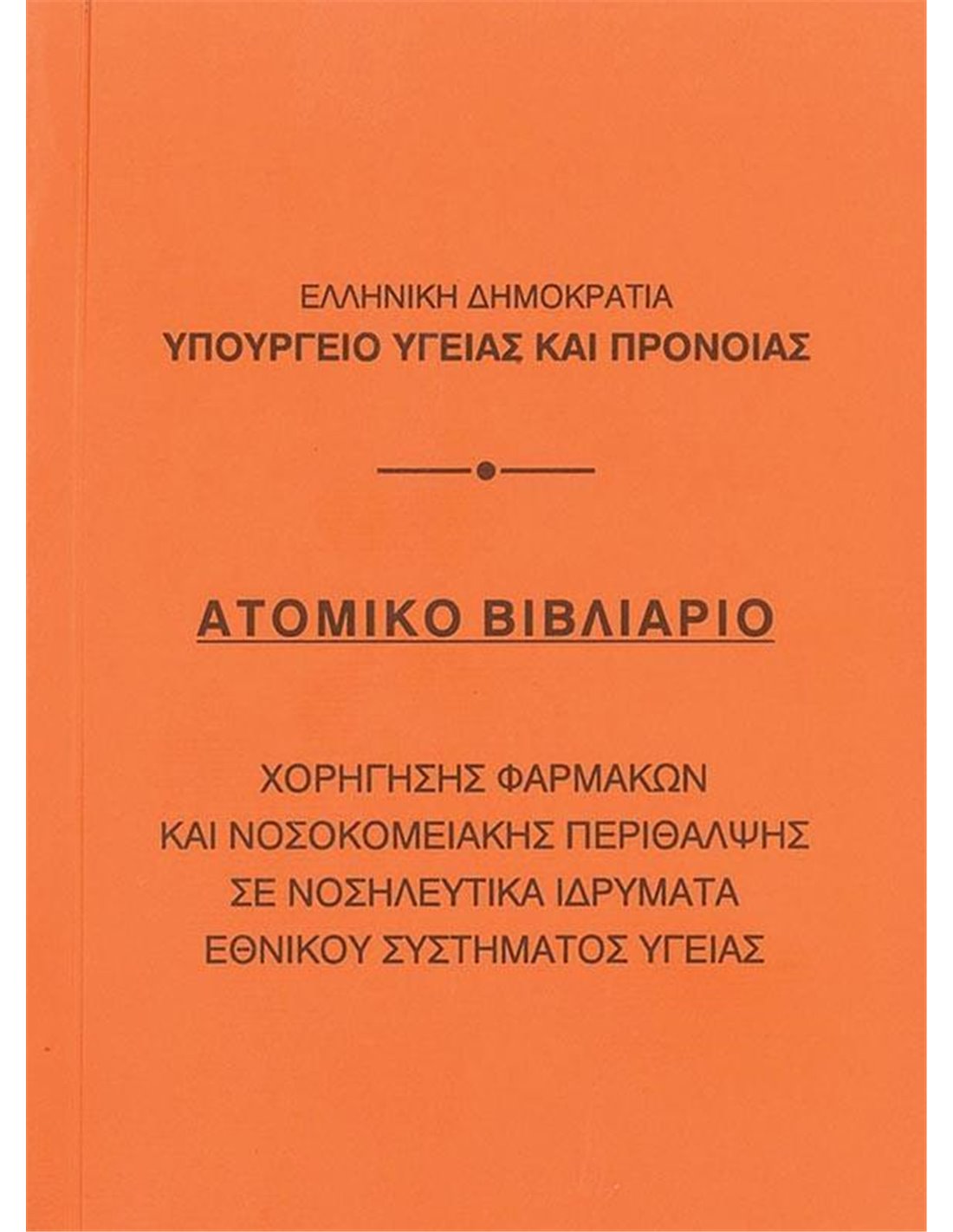 Ατομικό βιβλιάριο χορήγησης φαρμάκων και νοσοκομειακής περίθαλψης. Διάσταση: 10,5x14εκ.