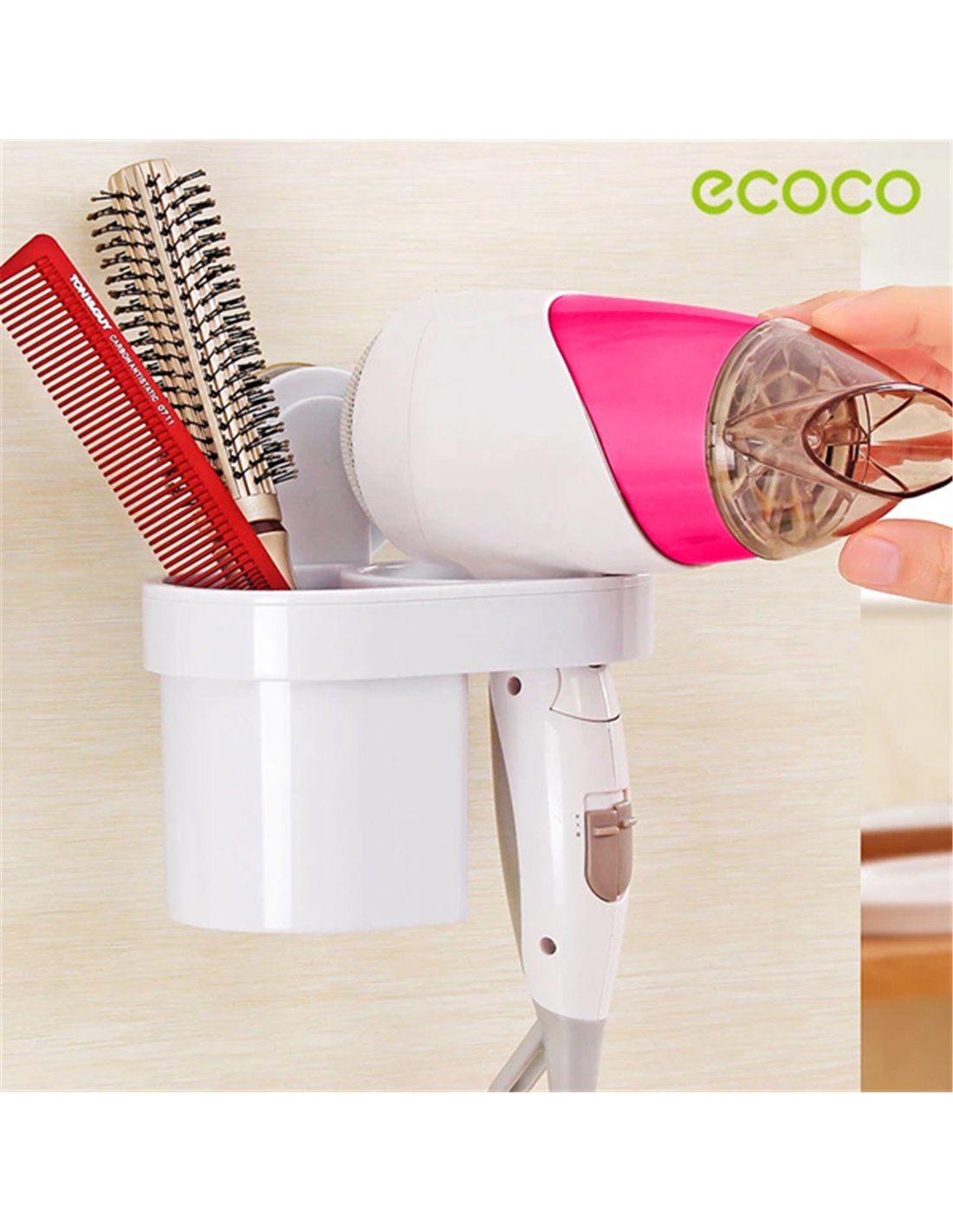 Βάση της Ecoco με μια θήκη για οδοντόβουρτσες, οδοντόκρεμες ή αλλά μικρά αντικείμενα υγιεινής και μια θήκη για σεσουάρ μαλλιών με ειδική υποδοχή για το καλώδιο. Επιδεικνύει ιδιαίτερη αντοχή και μπορείτε να τοποθετήσετε σε αυτήν αντικείμενα βάρους έως και 5 κιλά. Είναι συμβατό με τους περισσότερους τύπους σεσουάρ ενώ η τοποθέτηση της γίνεται εύκολα με αυτοκόλλητο κλιπ σε οποιαδήποτε επίπεδη επιφάνεια.