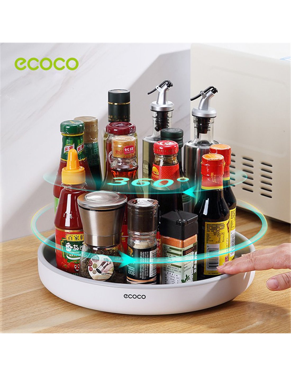 Επιτραπέζια βάση κουζίνας της Ecoco με περιστροφή 360°. Στην βάση μπορείτε να τοποθετήσετε μπουκάλια, βάζα, φρούτα κ.α. ενώ η τοποθέτηση της μπορεί να γίνει σε οποιαδήποτε επιτραπέζια επιφάνεια, μέσα σε ντουλάπι ή ράφι. Η περιστροφή 360° της βάσης, σας δίνει την δυνατότητα να επιλέγετε τα προϊόντα που επιθυμείτε, είτε αυτά βρίσκονται στο μπροστινό, είτε στο πίσω μέρος της βάσης χωρίς να χρειάζεται να μετακινήσετε τα υπόλοιπα προϊόντα. Το κάτω μέρος της βάσης είναι σχεδιασμένο με αντιολισθητικό υλικό εξασφαλίζοντας την σταθερότητα της κατά την διάρκεια της περιστροφής.