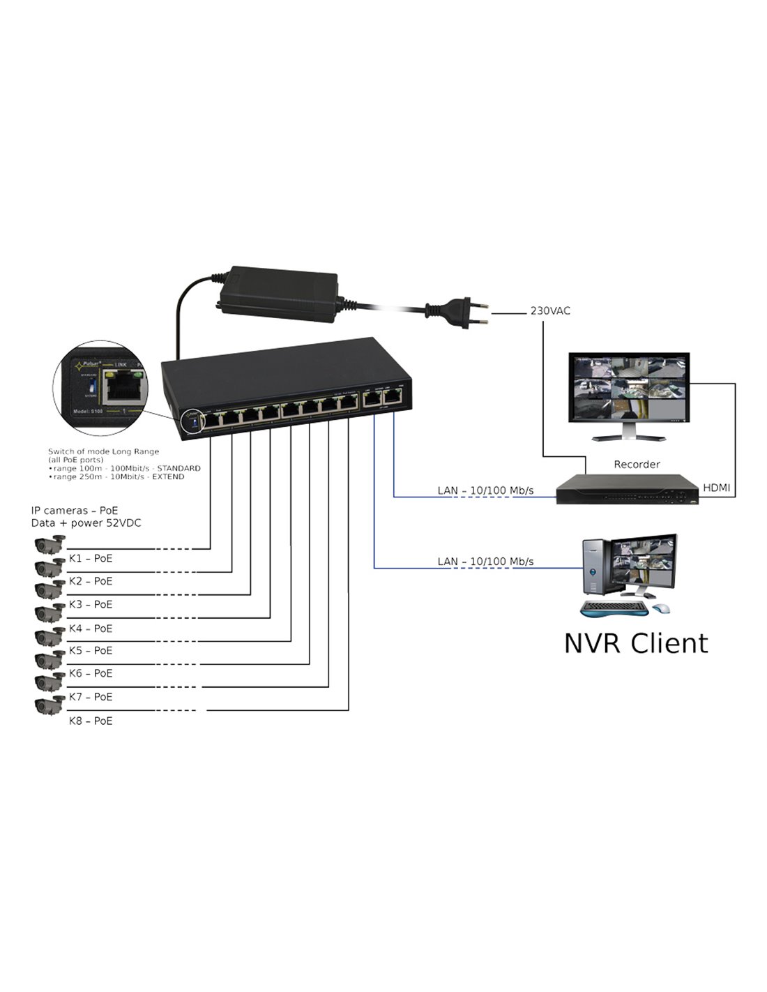 PULSAR PoE Ethernet Switch S108-90W, 10x ports 10/100Mb/s