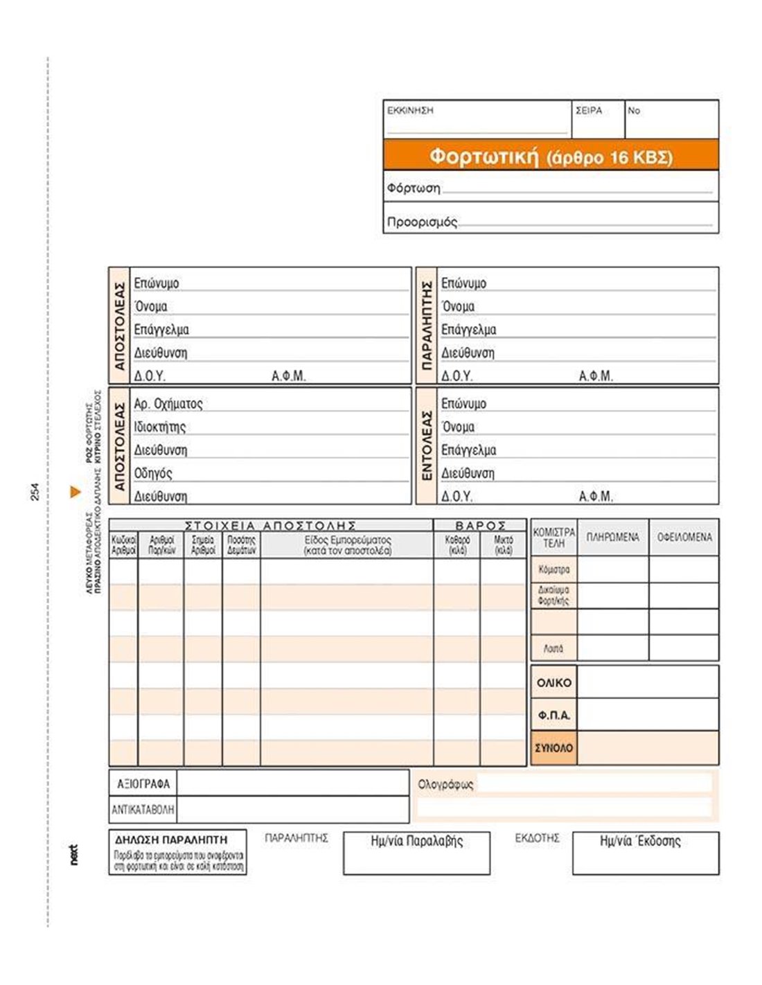 Φορτωτική, τετραπλότυπη 4x50 φύλλα. Διαστάσεις: 17x20εκ.