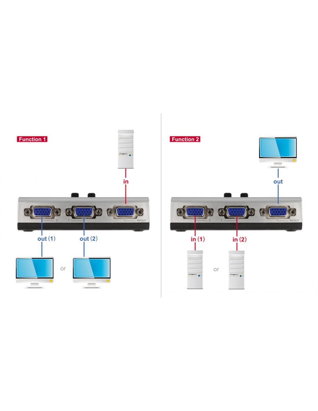 Bidirectional switch της Delock 2 θυρών, διπλής κατεύθυνσης για την σύνδεση συσκευών με θύρα VGA. Το switch καθιστά δυνατή την σύνδεση 2 συσκευών εικόνας με θύρα VGA σε ένα υπολογιστή ή 1 συσκευή εικόνας με θύρα VGA σε 2 υπολογιστές.