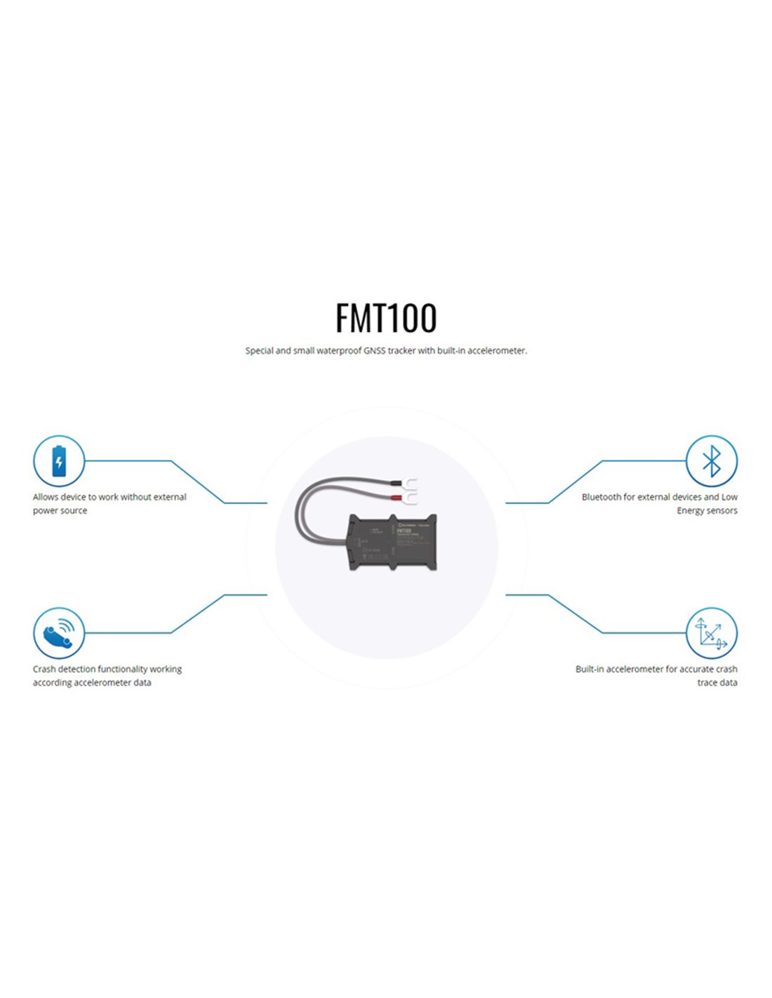 Το FMT1001A9S01 είναι ένα μοντέλο έξυπνης τεχνολογίας και μικρό σε μέγεθος. Υποστηρίζει σύνδεση Bluetooth, έχει εσωτερική κεραία GNSS μεγάλης εμβέλειας και επίσης διαθέτει εσωτερική εφεδρική μπαταρία. Είναι εξοπλισμένο με ειδικό clamp σύνδεσμο για γρήγορη σύνδεση του καλωδίου τροφοδοσίας με την μπαταρία του αυτοκινήτου. Διαθέτει στερεά αδιάβροχη θήκη και ενσωματωμένο αισθητήρα επιταχυνσιόμετρου με εξαιρετικά ακριβή λειτουργία εντοπισμού πρόσκρουσης, γεγονός που καθιστά αυτή τη συσκευή απόλυτα κατάλληλη για λύσεις ασφαλιστικής αγοράς.