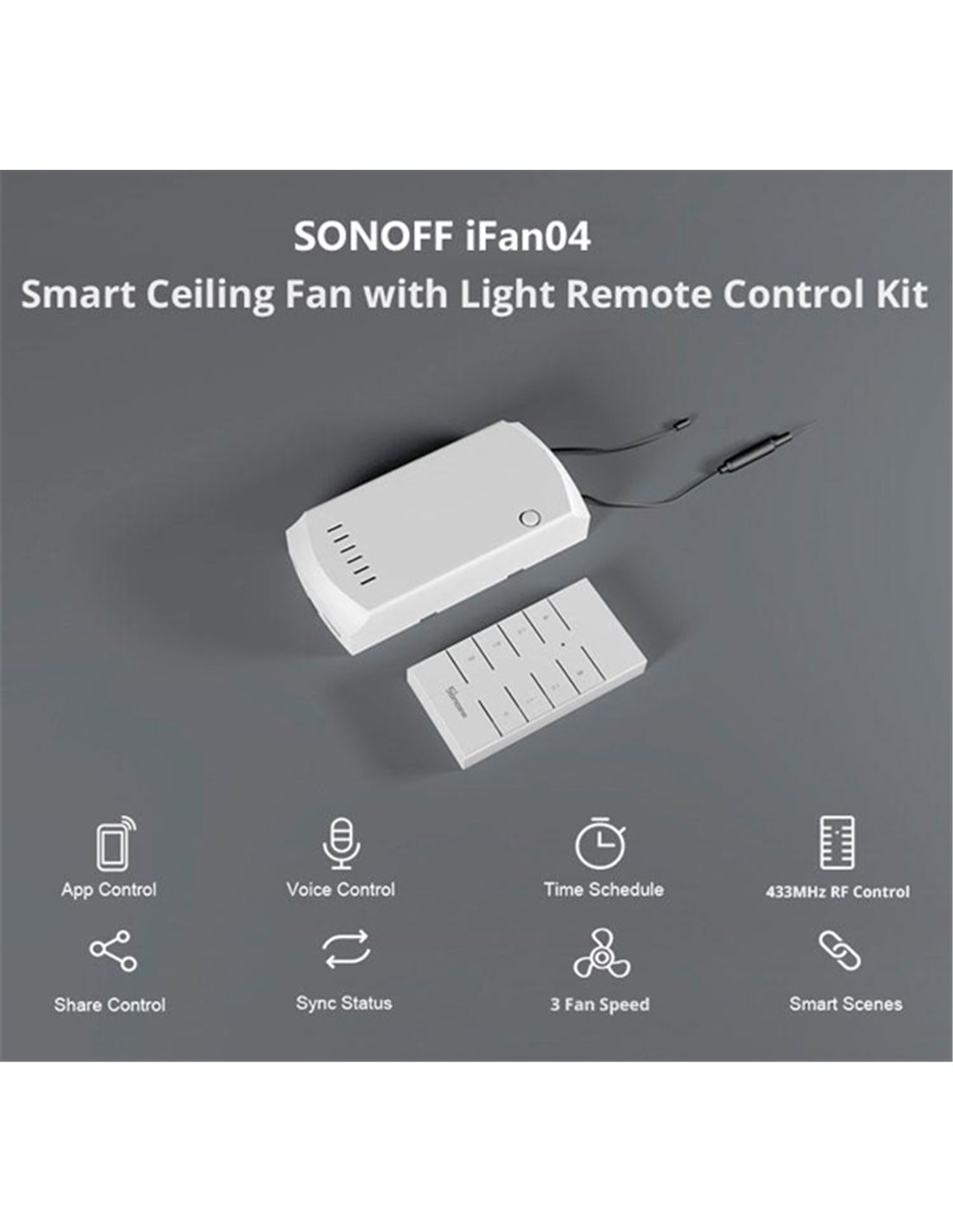 Είναι ένας Wi-Fi διακόπτης που σας επιτρέπει να ελέγχετε απομακρυσμένα ανεμιστήρες οροφής αλλά και τον φωτισμό του σπιτιού σας μέσω της εφαρμογή eWeLink από το smartphone σας. Μπορείτε να απενεργοποιήσετε ανά πάσα στιγμή τον ανεμιστήρα ή τον φωτισμό από όπου και αν βρίσκεστε ή να καθορίσετε προκαθορισμένο χρόνο για την ενεργοποίηση και απενεργοποίηση του.