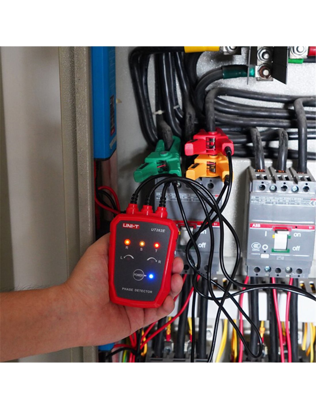 Με τους τρεις σφιγκτήρες κουμπωμένους στο μονωτικό στρώμα των τριφασικών ενεργών καλωδίων, μπορεί να ανίχνευση τη φάση, ενώ παράλληλα, ηχητικές και φωτεινές ενδείξεις υποδεικνύουν θετικές και αρνητικές καταστάσεις.