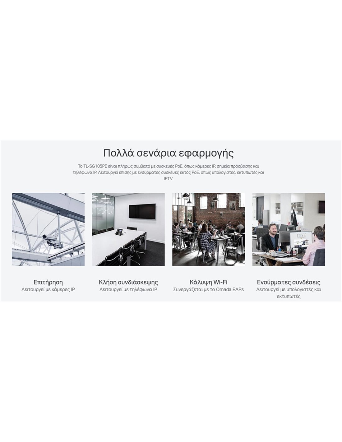 Το TL-SG105PE είναι ένα επαγγελματικό Gigabit Easy Smart Switch 5-θυρών με PoE + 4 θυρών, πλήρως συμβατό με συσκευές PoE, όπως κάμερες IP, σημεία πρόσβασης και τηλέφωνα IP. Λειτουργεί επίσης με ενσύρματες συσκευές εκτός PoE, όπως υπολογιστές, εκτυπωτές και IPTV.