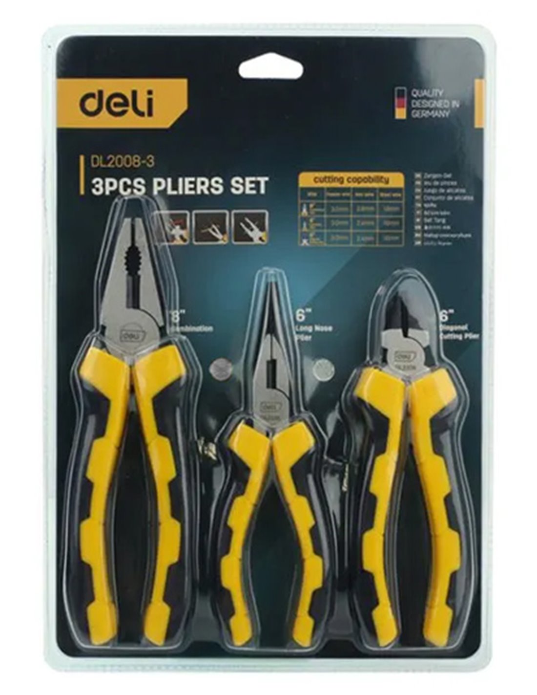 Σετ εργαλείων από την Deli που αποτελείται από μια πένσα, ένα μυτοτσίμπιδο και ένα πλαγιοκόφτη.