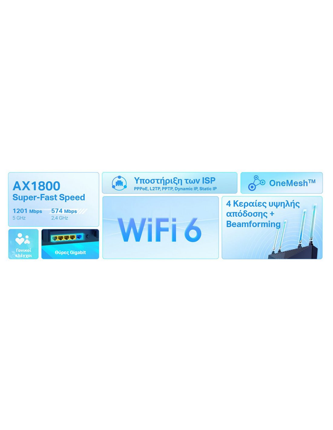 Το Archer AX23 χάρη στο τελευταίας γενιάς WiFi 6, προσφέρει γρηγορότερες ταχύτητες, λιγότερη καθυστέρηση και υψηλότερη χωρητικότητα, επιτρέποντας ταυτόχρονες συνδέσεις στο οικιακό σας δίκτυο. Ολοκληρώστε απλές εργασίες, όπως αποστολή e-mail ή περιήγηση στο internet στη ζώνη 2.4 GHz με ταχύτητες έως 574 Mbps και πιο απαιτητικές εργασίες, όπως διαδικτυακά παιχνίδια ή παρακολούθηση ταινιών στη ζώνη 5 GHz με ταχύτητες έως 1201 Mbps, ταυτόχρονα και χωρίς καθυστέρηση.