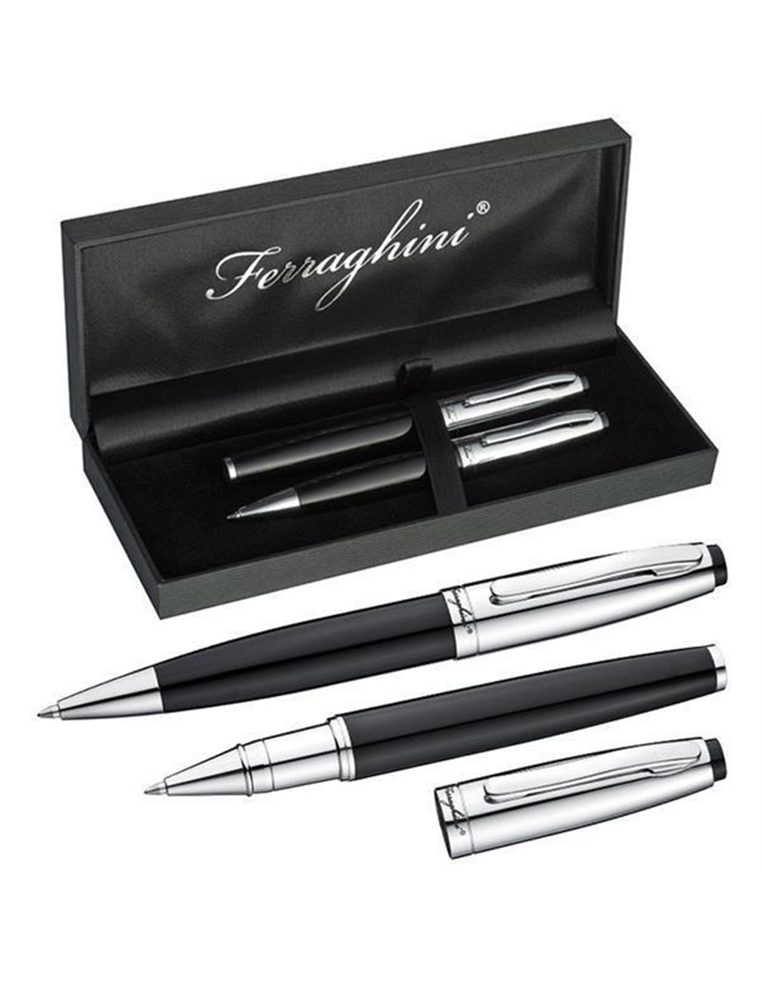 Σετ στυλό Ferraghini ball pen -rolleball pen. Σε πολυτελή θήκη δώρου. Χρώμα: μαύρο-ασημί. Χρώμα γραφής: μπλε.
