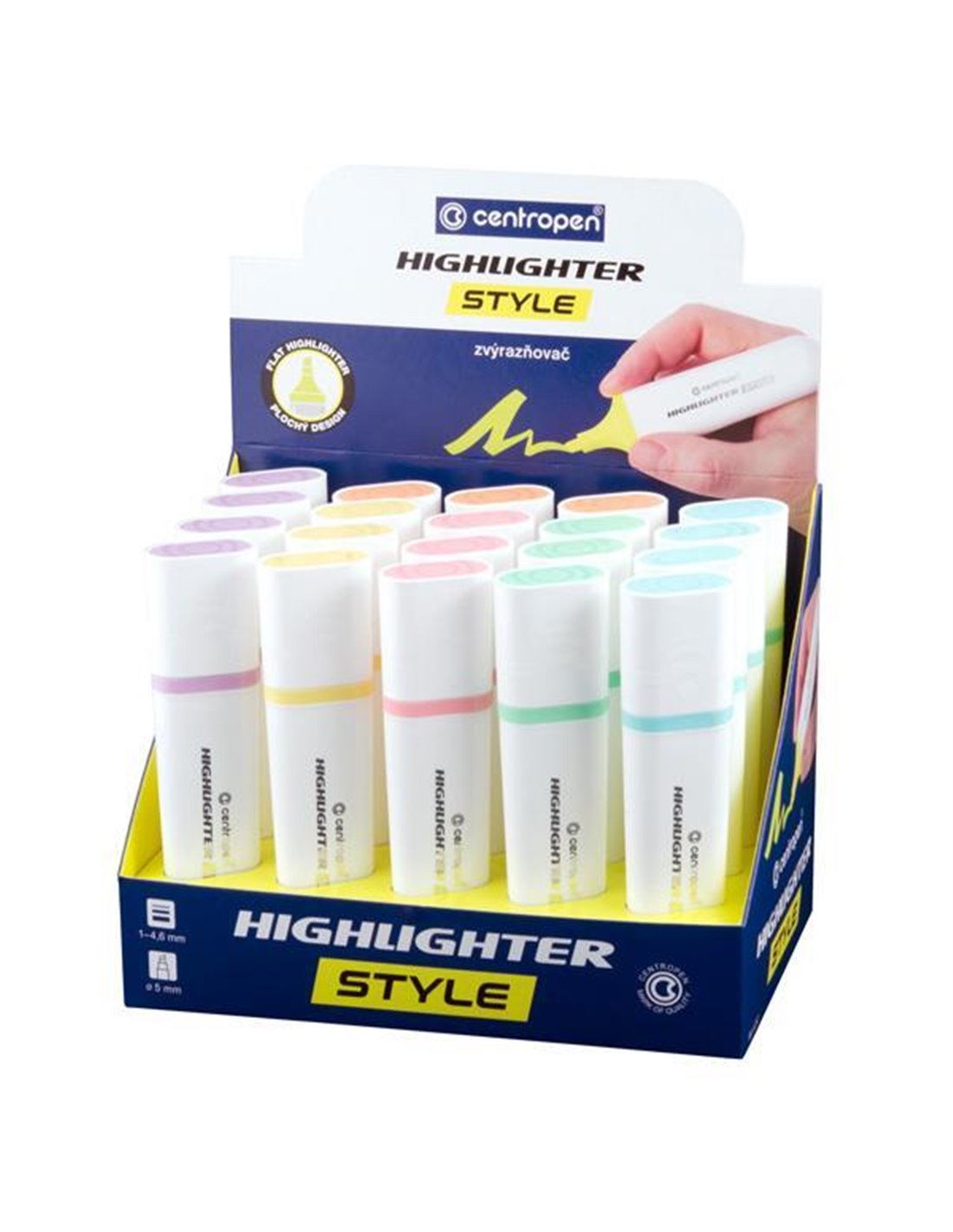 Centropen μαρκαδόροι υπογράμμισης (highlighter), υψηλής ποιότητας σε pastel χρώματα, με κομψό σχεδιασμό, για ομαλή και εύκολη επισήμανση κειμένου σε κάθε είδους χαρτί. Πλάτος γραμμής 1 – 4,6 mm. Διατίθεται σε σταντ των 20 τεμαχίων το οποίο περιλαμβάνει 6 χρώματα. Κατασκευάζονται στην Τσεχία.