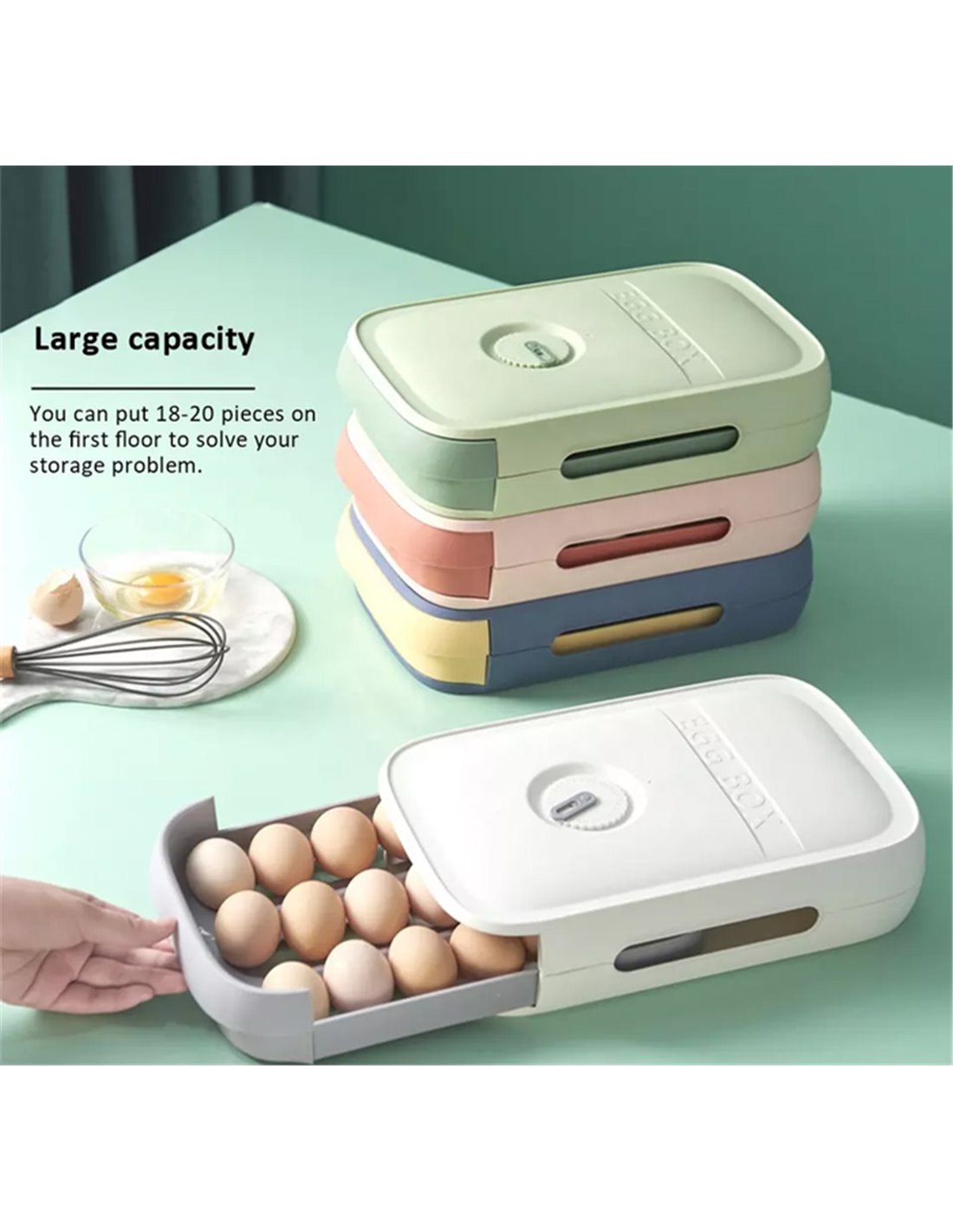 Πλαστική θήκη ιδανική για την αποθήκευση 18 έως 20 αυγών. Διαθέτει συρόμενη πόρτα γεγονός που διευκολύνει την πρόσβαση στα αποθηκευμένα αυγά. Μπορεί να τοποθετηθεί σε πάγκο κουζίνας αλλά και σε ψυγείο.