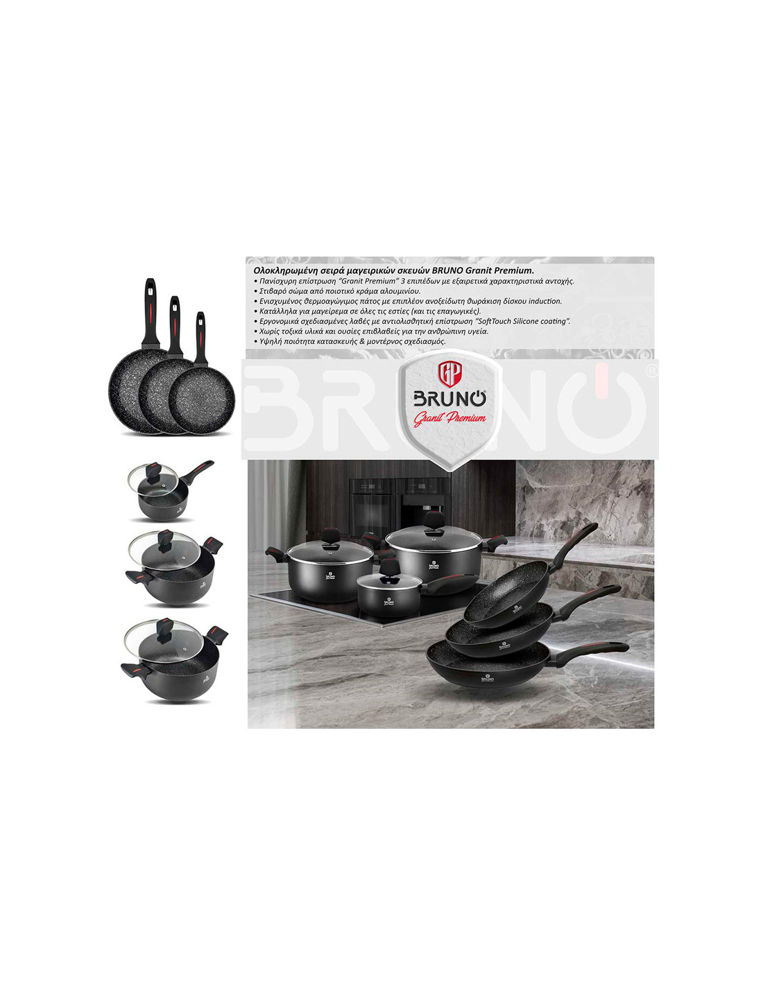 Bruno τηγάνι της σειράς Granit Premium με αντικολλητική επίστρωση εξαιρετικής αντοχής. Διαθέτει 3 επίπεδα premium επίστρωσης και εργονομική, αντιολισθητική λαβή. Κατασκευασμένο χωρίς τοξικά υλικά, κατάλληλο για όλες τις εστίες.
