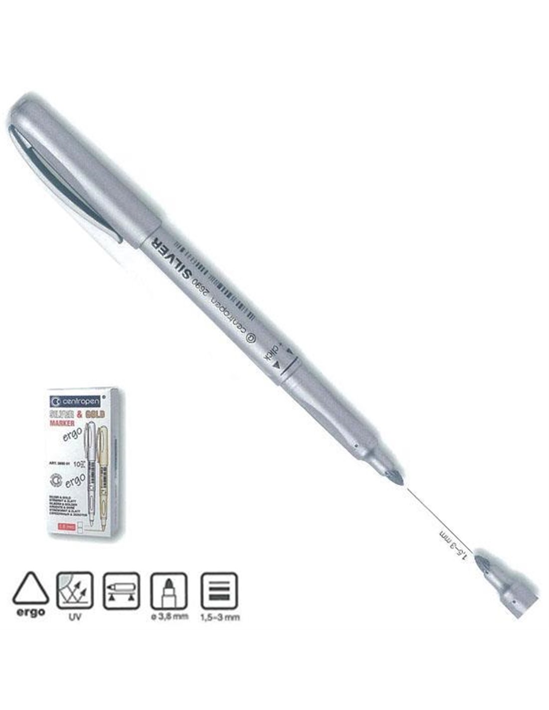 Centropen μαρκαδόρος ανεξίτηλος 1,5mm . Χρώμα: ασημί. Γράφει σε πορώδεις και μη επιφάνειες, αντέχει στο νερό και είναι ανθεκτικό στις καιρικές συνθήκες. Στεγνώνει αμέσως.