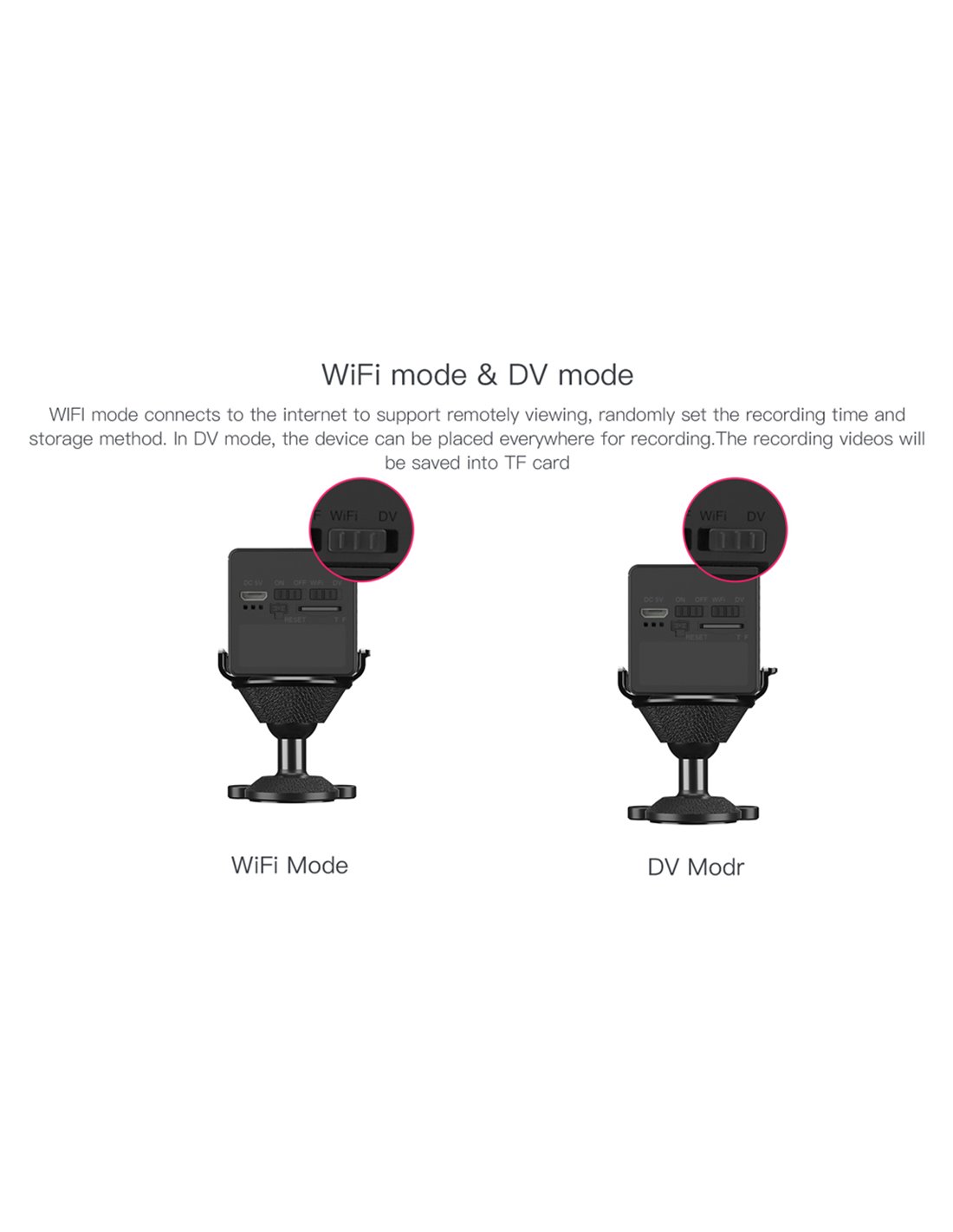 Η κάμερα μπορεί, επίσης, να ενεργοποιήσει ηχητικό και οπτικό συναγερμό κατά τον εντοπισμό παραβίασης. Υποστηρίζει 2 τρόπους λειτουργίας, WiFi και DV η οποία δίνει την δυνατότητα καταγραφής στην κάρτα microSD, χωρίς να απαιτείται ασύρματο δίκτυο και λειτουργία νυχτερινής όρασης για την παρακολούθηση ακόμη και στο σκοτάδι. Στην συσκευασία συμπεριλαμβάνονται όλα τα απαραίτητα αξεσουάρ εγκατάστασης αλλά και αντάπτορας για την τροφοδοσία της κάμερας.
