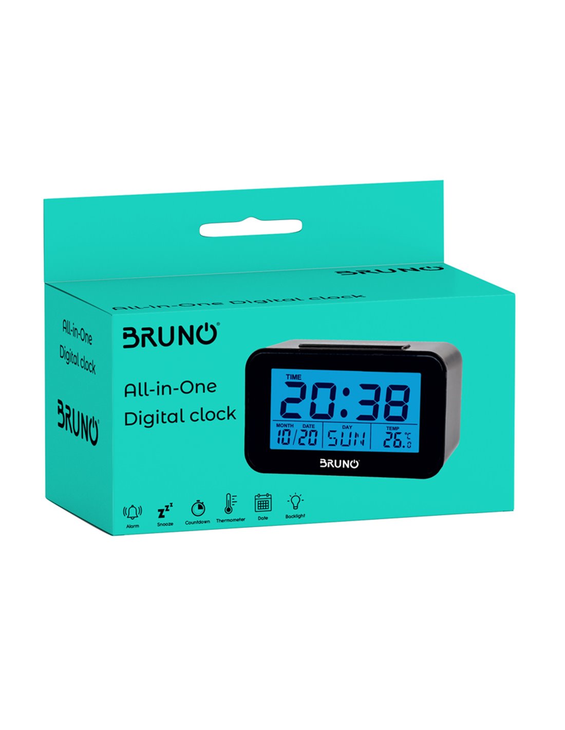 BRUNO ξυπνητήρι με μεγάλη ευανάγνωστη οθόνη και μέτρηση θερμοκρασίας. Υποστηρίζει λειτουργία αντίστροφης μέτρησης και λειτουργία snooze. Διαθέτει οπίσθιο φωτισμό με το πάτημα ενός κουμπιού.