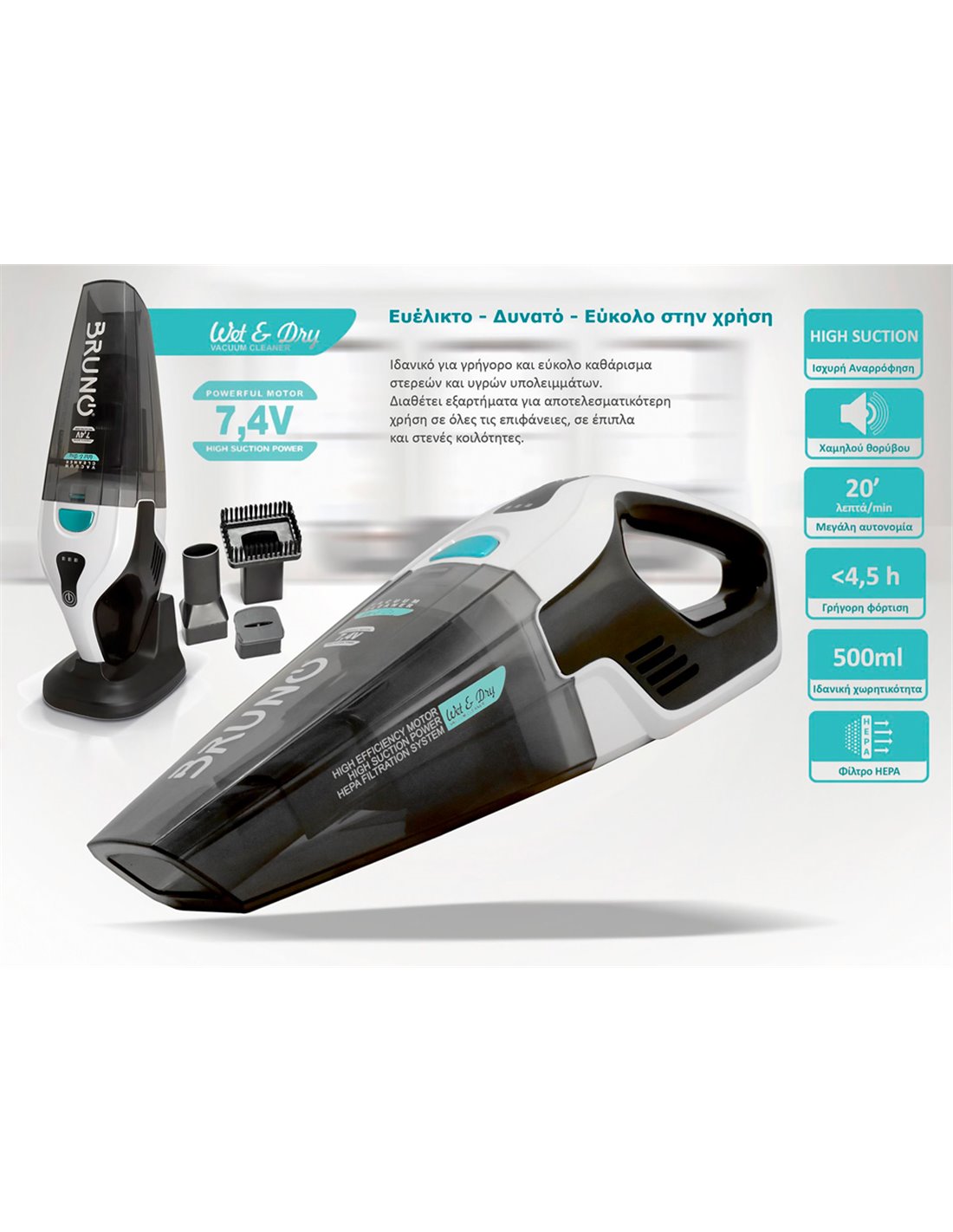 BRUNO σκουπάκι υγρών & στερεών BRN-0131, επαναφορτιζόμενο, φίλτρο HEPA