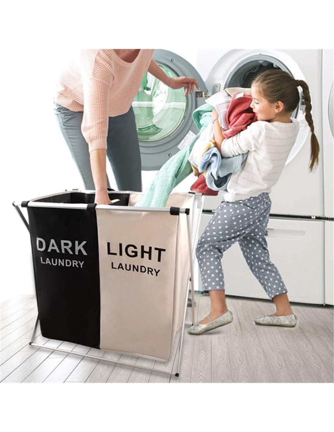 Καλάθι απλύτων με 2 σάκους και σχεδιασμό που χρησιμεύει ως ταξινομητής για λευκά ή σκούρα ρούχα και καθιστά τη διαδικασία του πλυσίματος πολύ ευκολότερη.