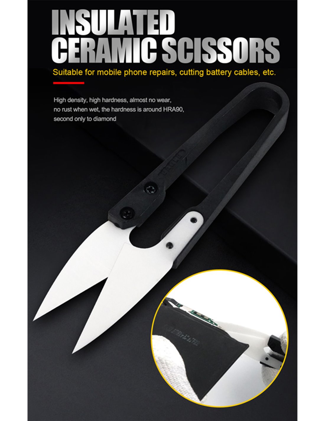 Κεραμικό ψαλίδι με μόνωση, ανθεκτικό στις υψηλές θερμοκρασίες που το καθιστά κατάλληλο για επισκευές smartphone, κόψιμο μπαταριών και καλωδίων κ.λπ.