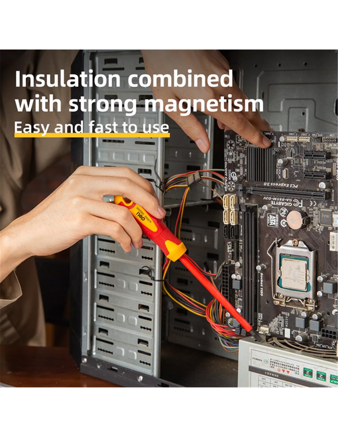 Σταυρωτό κατσαβίδι ηλεκτρολόγου από την Deli με πιστοποίηση VDE για αντοχή σε τάση 1000V. Η μύτη του κατσαβιδιού διαθέτει μαγνητική ιδιότητα ενώ η αντιολισθητική λαβή του προσφέρει άνετο κράτημα κατά την διάρκεια της εργασίας.
