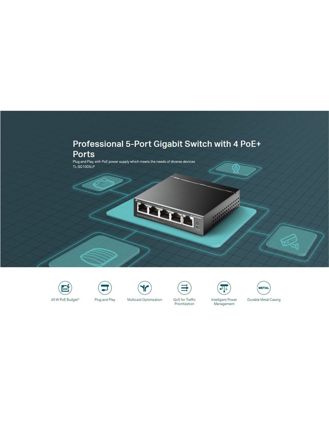 Το TL-SG1005LP είναι ένα switch επαγγελματικών προδιαγραφών που εξοπλίζεται με 5 θύρες δικτύου με ταχύτητες 10/100/1000Mbps. Από τις θύρες δικτύου που εξοπλίζεται, οι 4 υποστηρίζουν PoE+ για την μεταφορά δεδομένων και ισχύς με ένα μόνο καλώδιο.