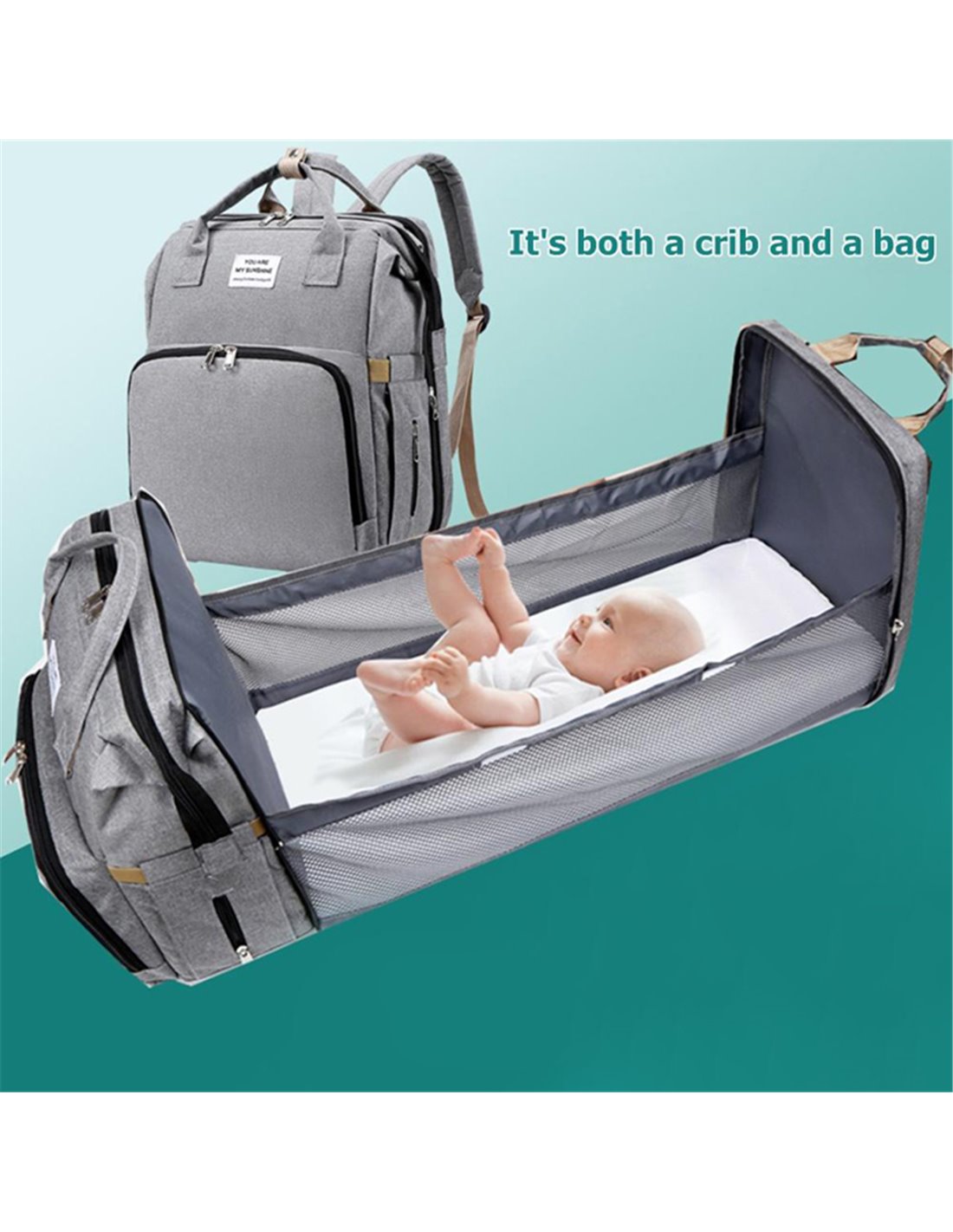 Τσάντα πλάτης που μετατρέπεται σε παιδικό κρεβατάκι. Είναι κατασκευασμένη από υψηλής ποιότητας υλικά και αδιάβροχη. Διαθέτει πολλαπλούς χώρους αποθήκευσης μέσα στους οποίους μπορούν να αποθηκευθούν ρούχα, πάνες, πετσέτες, μπιμπερό με γάλα κ.α. Επιπλέον ο εργονομικός σχεδιασμός καθιστά την τσάντα εύκολη και άνετη στην μεταφορά της.