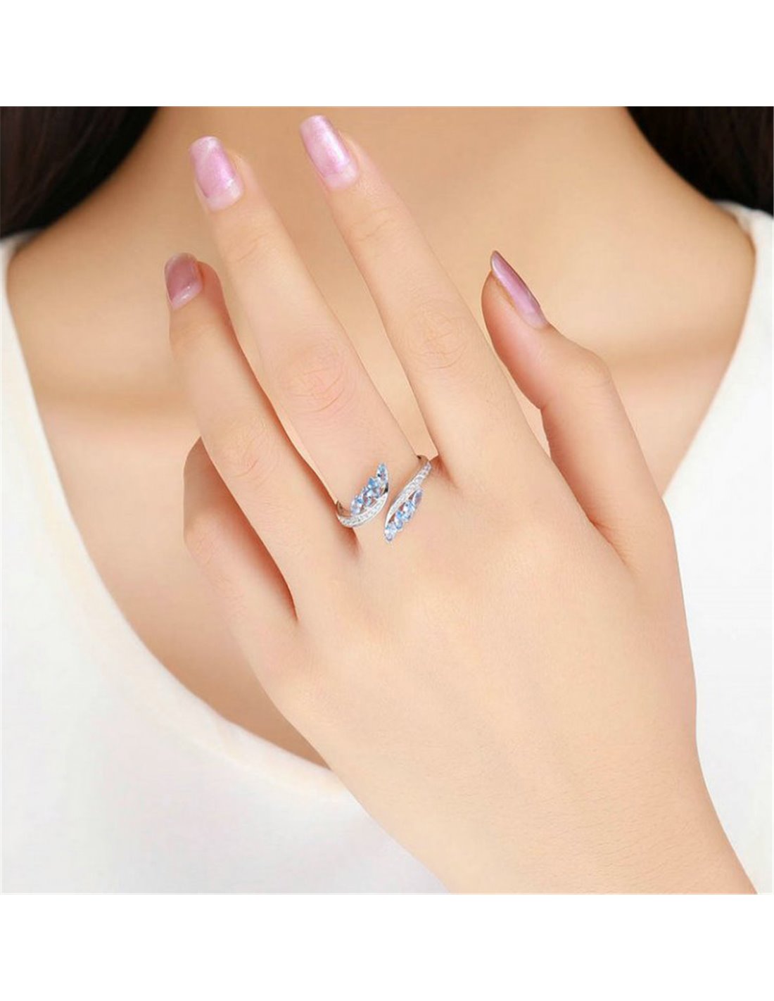 Κομψό δαχτυλίδι σε σχέδιο φύλλου ιτιάς, διακοσμημένο με αστραφτερή κυβική ζιρκόνια, λευκού και μπλε χρώματος, η οποία προσφέρει μοναδική λάμψη στο κόσμημα.