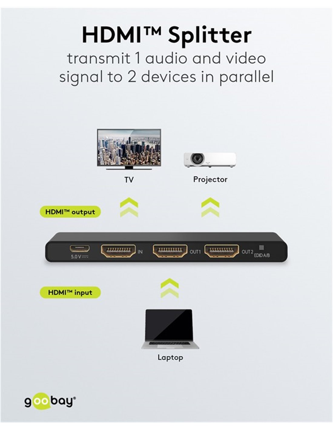 Το HDMI splitter της Goobay σας επιτρέπει την σύνδεση 1x συσκευής εισόδου όπως PC σε 2x συσκευών εξόδου όπως οθόνες.