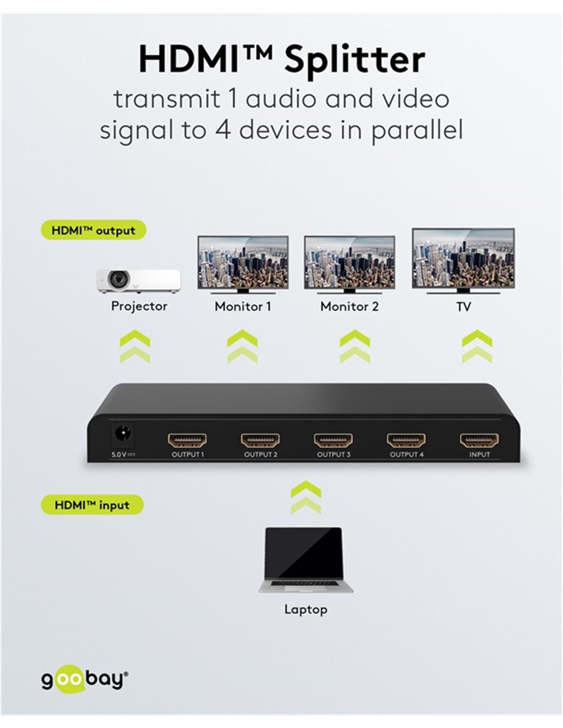Το HDMI splitter της Goobay σας επιτρέπει την σύνδεση 1x συσκευής εισόδου όπως PC σε 4x συσκευών εξόδου όπως οθόνες.