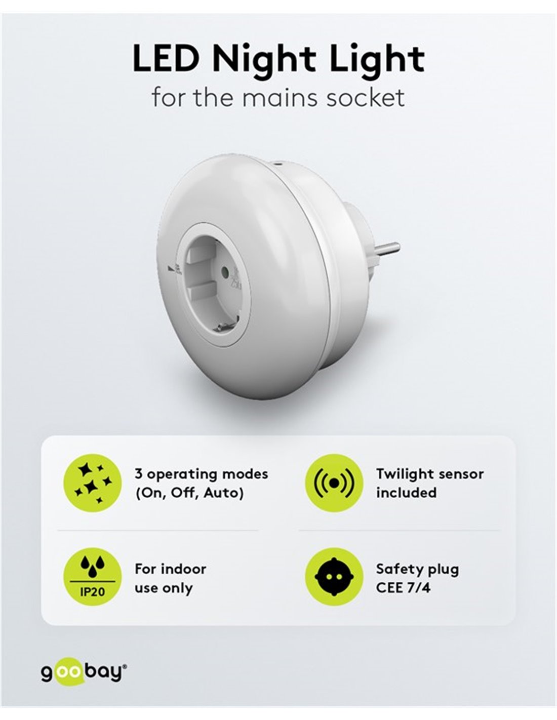 Φωτιστικό νυκτός LED της Goobay με passthrough πρίζα schuko για την αξιοποίηση της πρίζας του σπιτιού. Εξοπλίζεται με αισθητήρα φωτός για την αυτόματη ενεργοποίηση του φωτιστικού όταν η φωτεινότητα φτάσει σε επίπεδο κάτω από 21 lx.