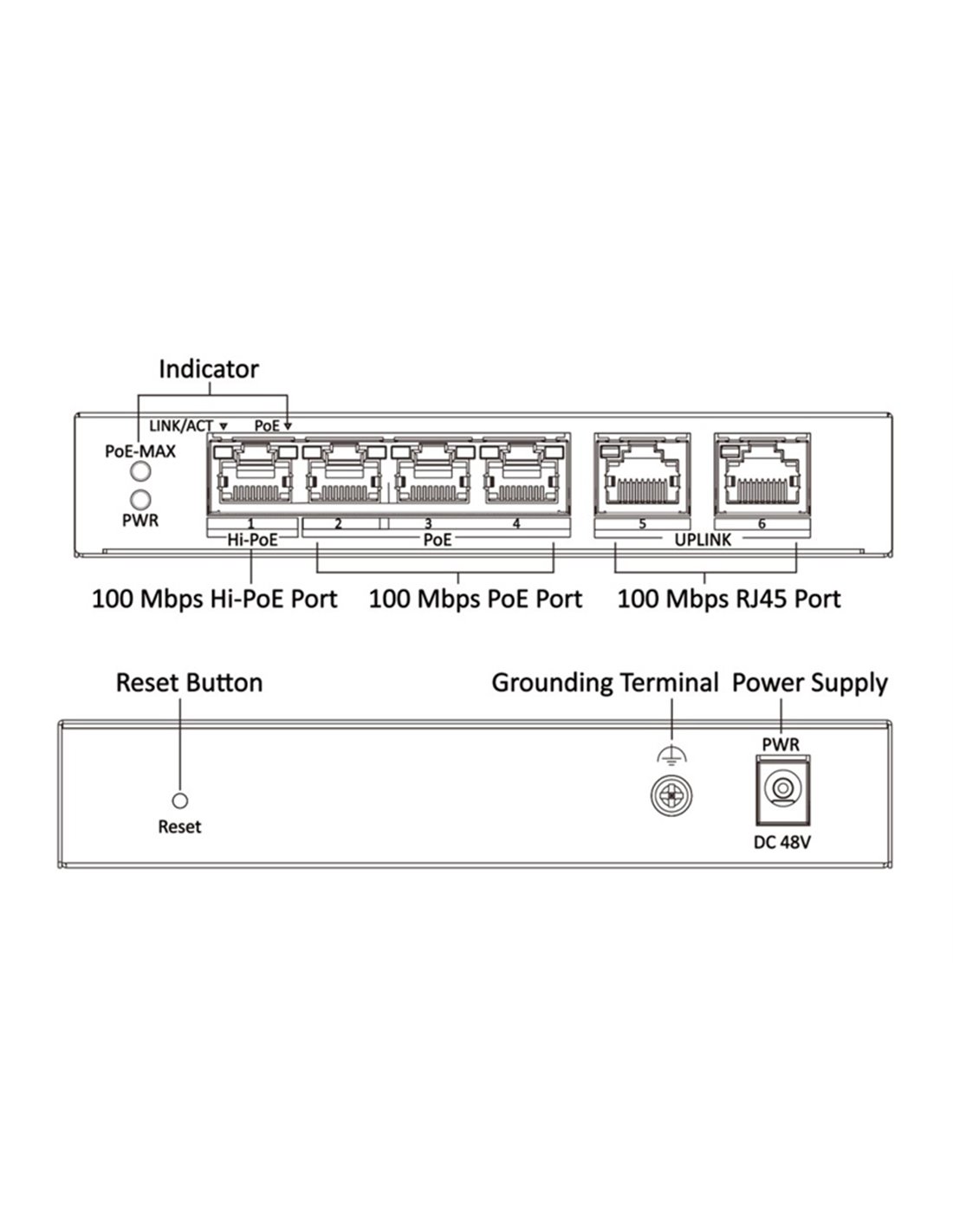 Port Number: 4x 100 Mbps PoE RJ45 port, and 2x 100 Mbps network RJ45 ports