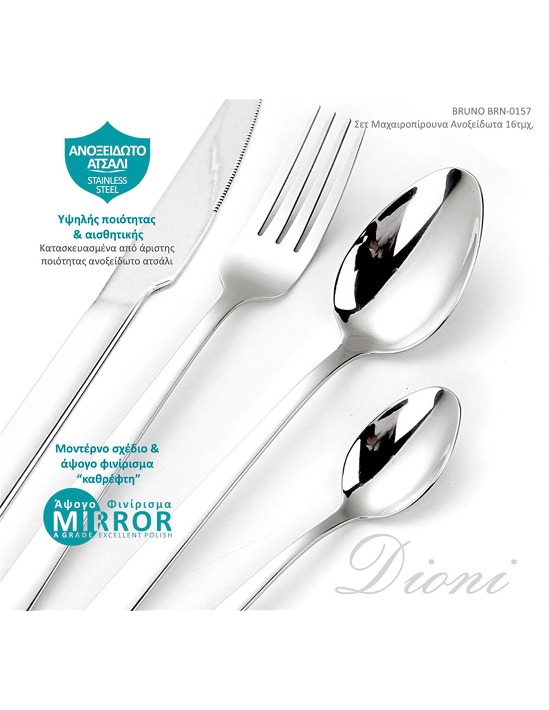Σετ μαχαιροπίρουνα 16 τεμαχίων Dioni από την Bruno, υψηλής ποιότητας και αισθητικής, κατασκευασμένα από άριστης ποιότητας ανοξείδωτο ατσάλι σε μοντέρνο σχέδιο και άψογο φινίρισμα "καθρέφτη".