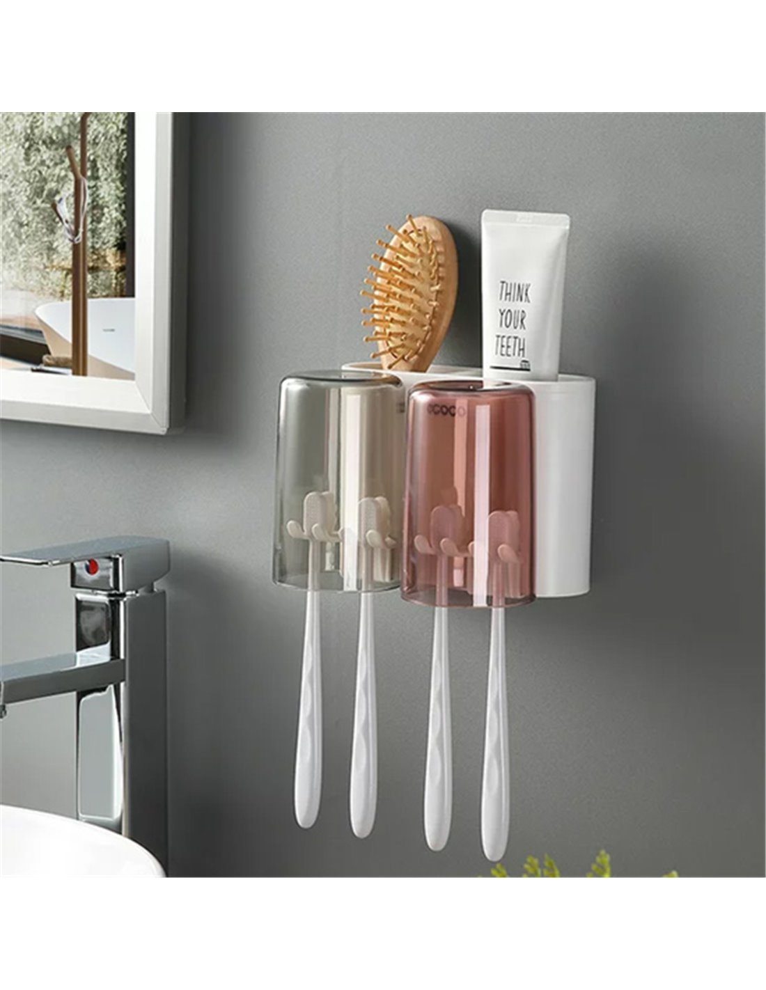 Διαθέτει 2 διάφανα ποτήρια και 2 θήκες όπου μπορούν να τοποθετηθούν οδοντόβουρτσες, οδοντόκρεμες ή αλλά αντικείμενα υγιεινής.