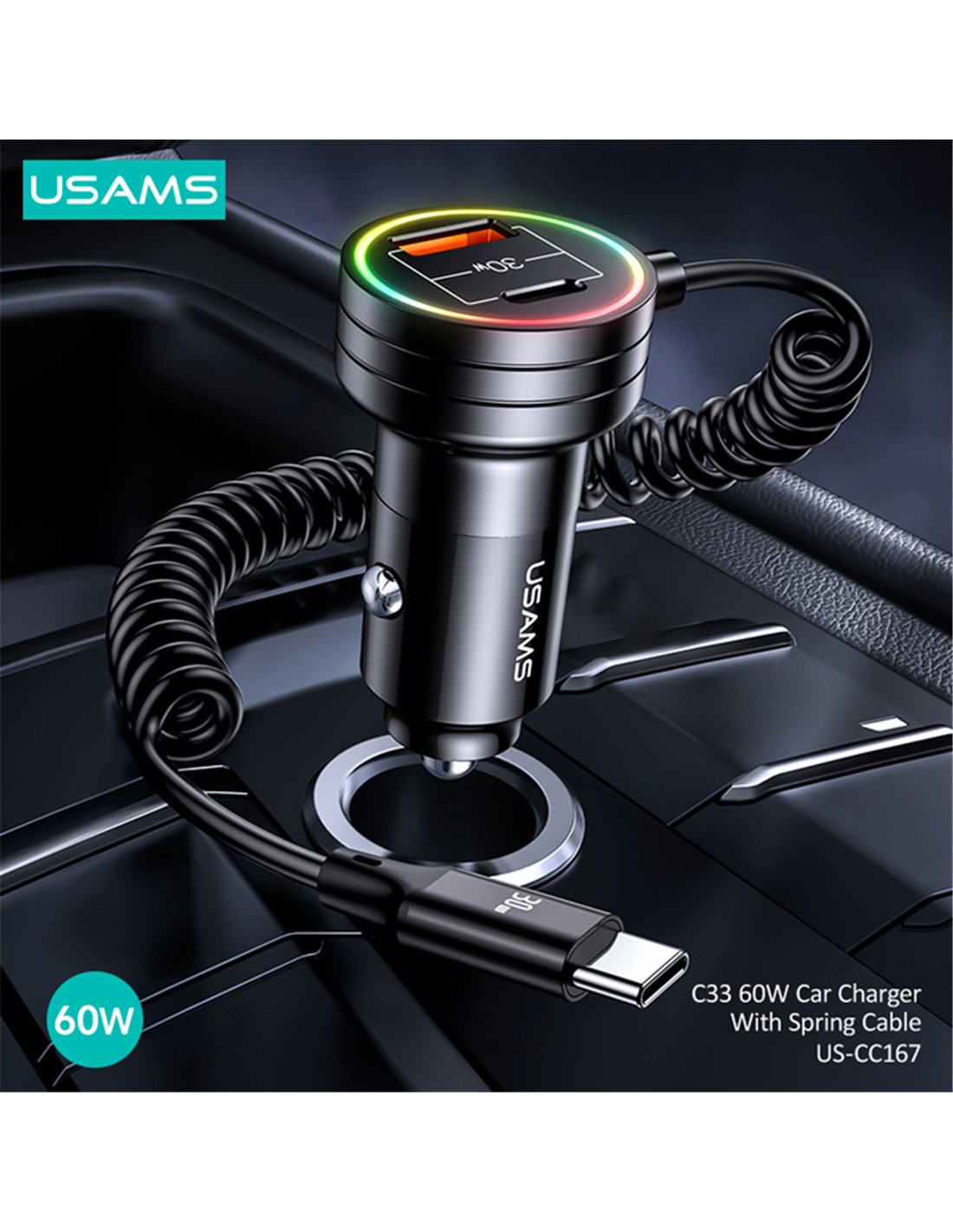 USAMS φορτιστής αυτοκινήτου US-CC167 με καλώδιο, USB/USB-C, 60W, μαύρος