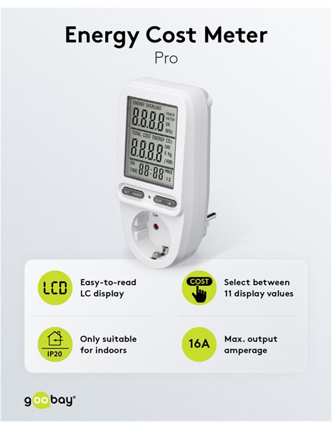 Μετρητής της Goobay για τη μέτρηση της κατανάλωσης ρεύματος των συνδεδεμένων οικιακών ηλεκτρικών συσκευών. Ενσωματώνει ευανάγνωστη οθόνη που σας επιτρέπει να παρακολουθείτε την κατανάλωση του ρεύματος κόστος σε ευρώ/kWh αλλά και τον χρόνο κατανάλωσης. Τα δεδομένα μπορούν να αποθηκευτούν για έως 20 λεπτά μετά την αποσύνδεση της συσκευής, επιτρέποντας σας την εναλλαγή διαφορετικών ηλεκτρικών συσκευών χωρίς να χάσετε τα δεδομένα.