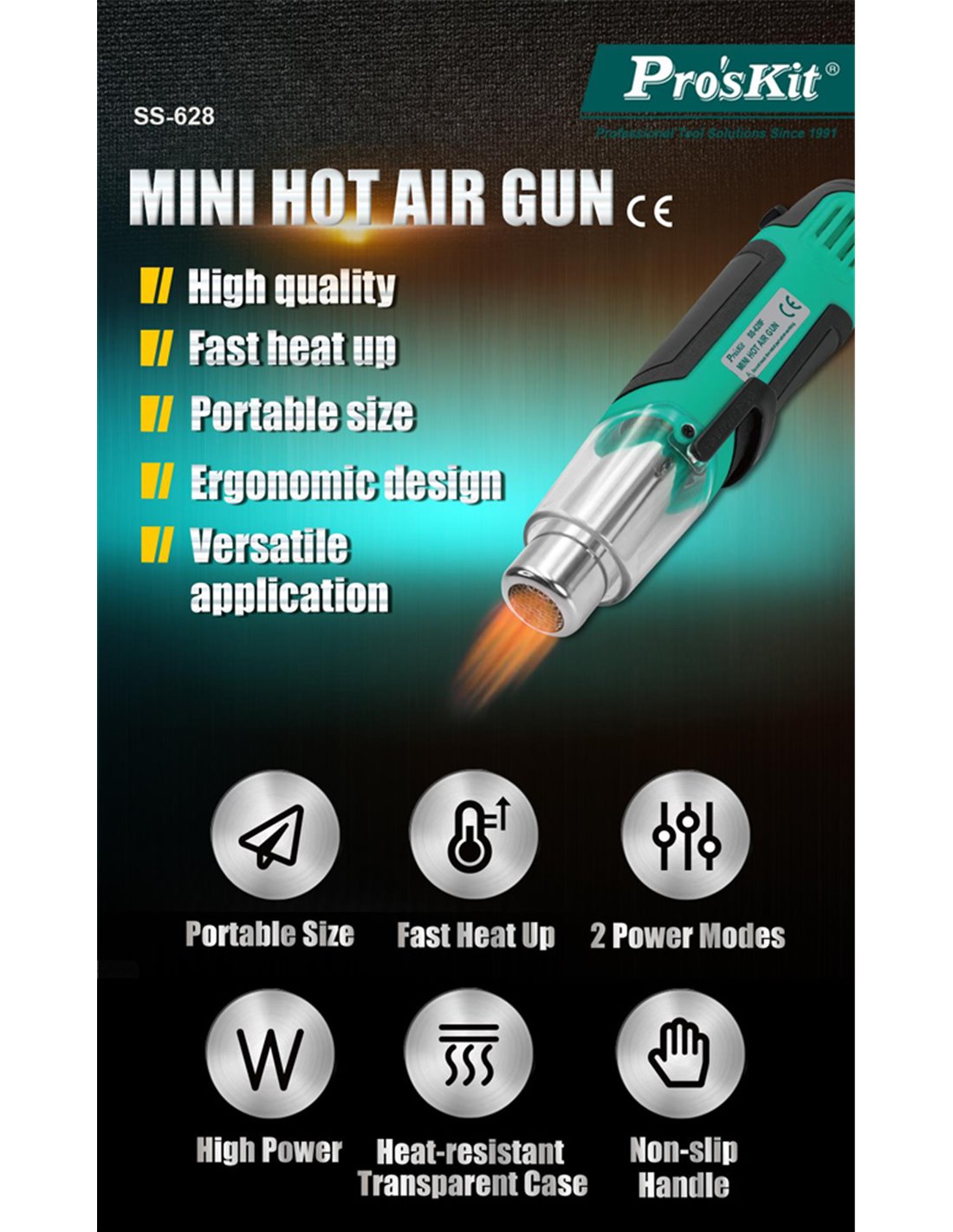 Μίνι πιστόλι θερμού αέρα της PROSKIT κατάλληλο για εφαρμογές όπως η συρρίκνωση θερμοσυστελλόμενων, η αφαίρεση χρωμάτων και η αποκόλληση εξαρτημάτων κ.α.