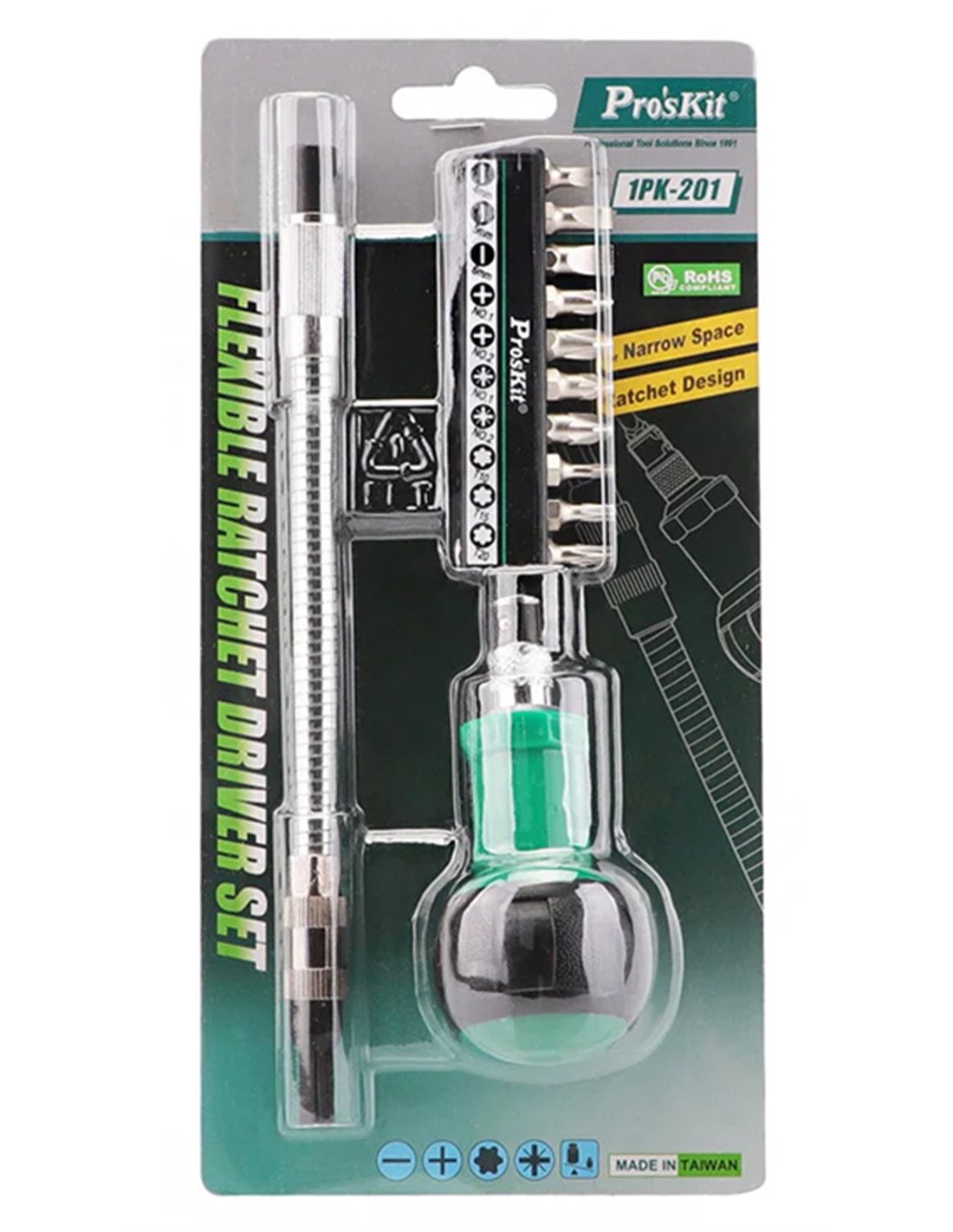 Σετ της PROSKIT το οποίο αποτελείται από 1 κατσαβίδι καστάνιας, 1 εύκαμπτο αντάπτορα επέκτασης και 10 διαφορετικές μύτες κατσαβιδιού.
