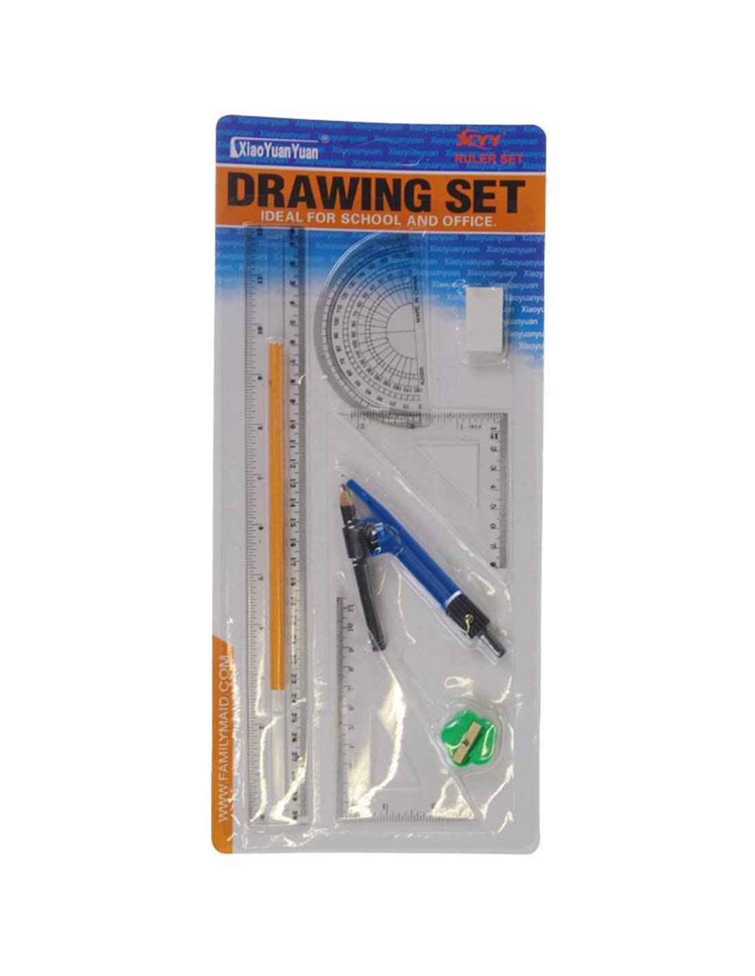 Το σετ περιλαμβάνει 1 χάρακα 30εκ., 2 τρίγωνα, 1 μοιρογνωμόνιο, 1 διαβήτη με μολύβι,