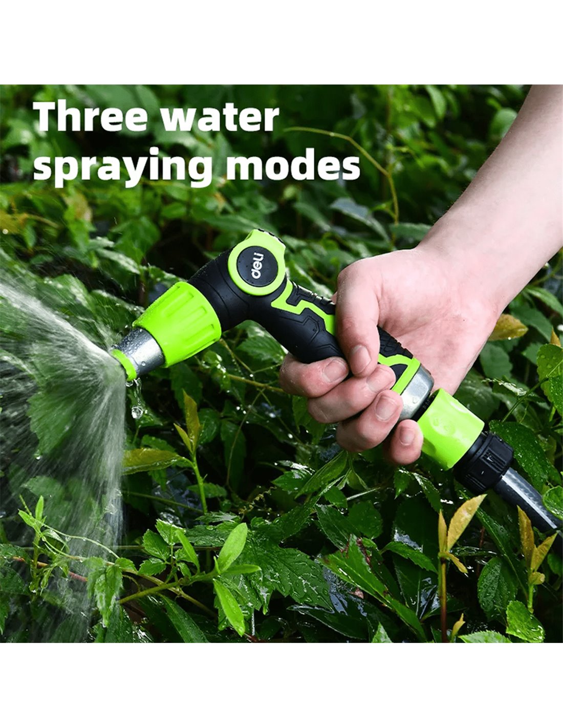 Πιστόλι εκτόξευσης νερού της Deli με 3 λειτουργίες ψεκασμού. Διαθέτει αντιολισθητική λαβή που εφαρμόζει καλά στο χέρι για πιο ξεκούραστο πότισμα.