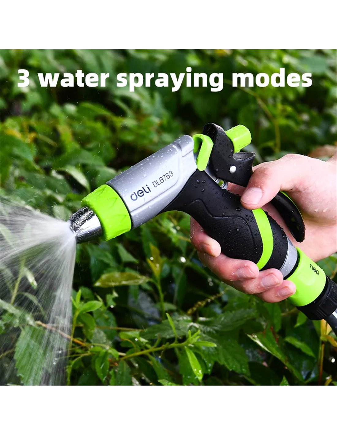 Πιστόλι εκτόξευσης νερού της Deli με 3 λειτουργίες ψεκασμού. Διαθέτει αντιολισθητική λαβή που εφαρμόζει καλά στο χέρι για πιο ξεκούραστο πότισμα.