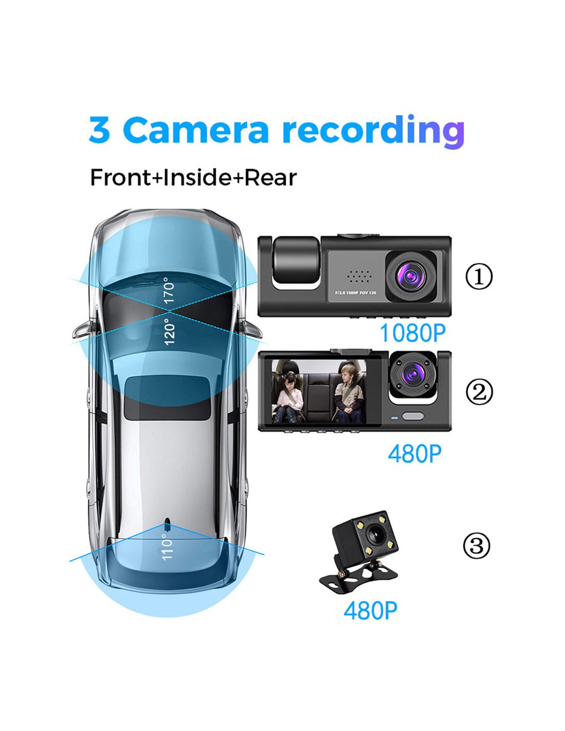 POWERTECH κάμερες αυτοκινήτου PT-1331, μπροστινή/καμπίνας/οπισθοπορείας, 2" οθόνη, 1080p/480p