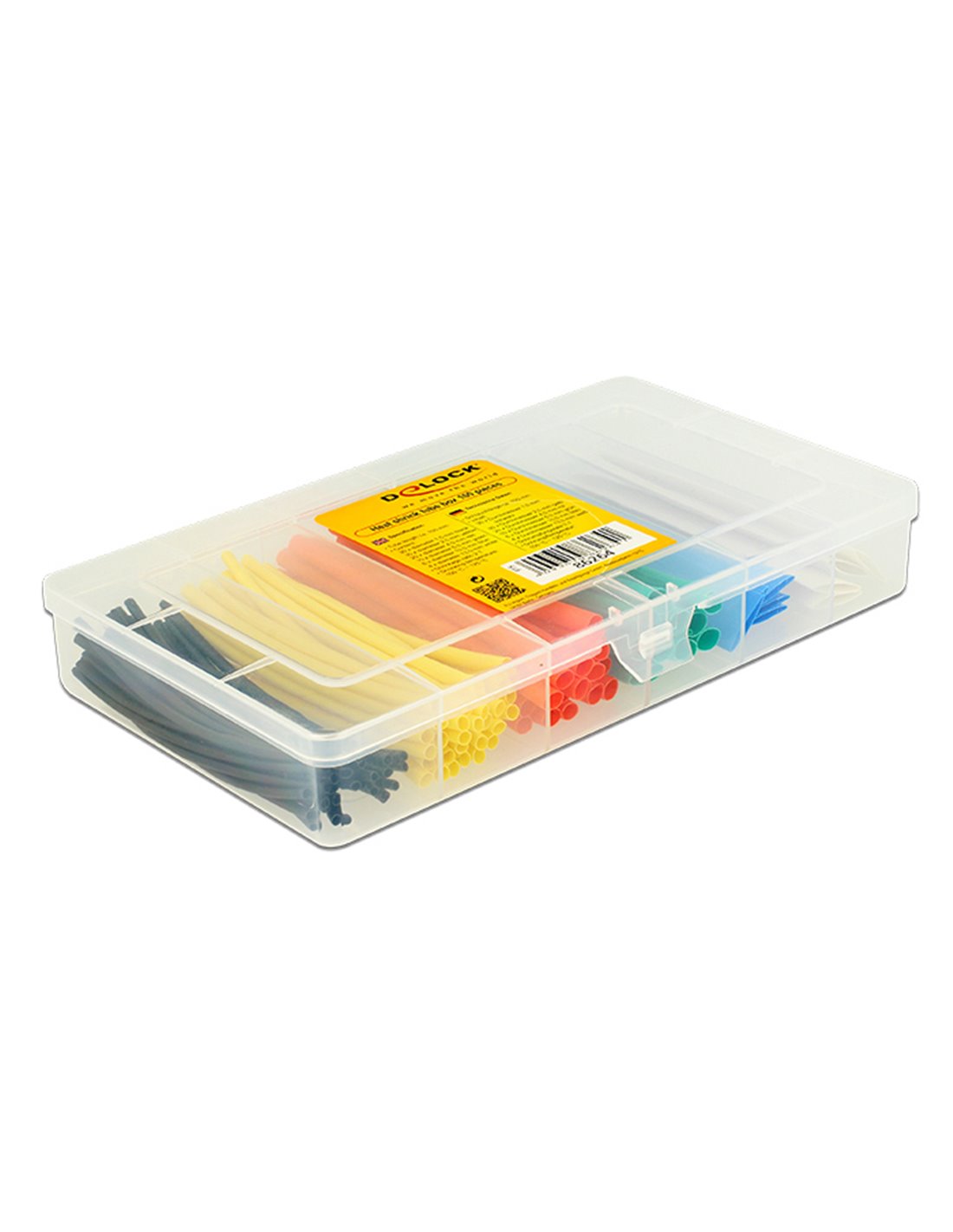 Το σετ περιλαμβάνει 100 θερμοσυστελλόμενα σε 6 διαφορετικές διαμέτρους και χρώματα. Είναι τοποθετημένα μέσα σε πλαστικό κουτί για την ταξινόμηση και προστασία των μονωτικών το οποίο μπορεί να επαναχρησιμοποιηθεί για την αποθήκευση διαφόρων αξεσουάρ.