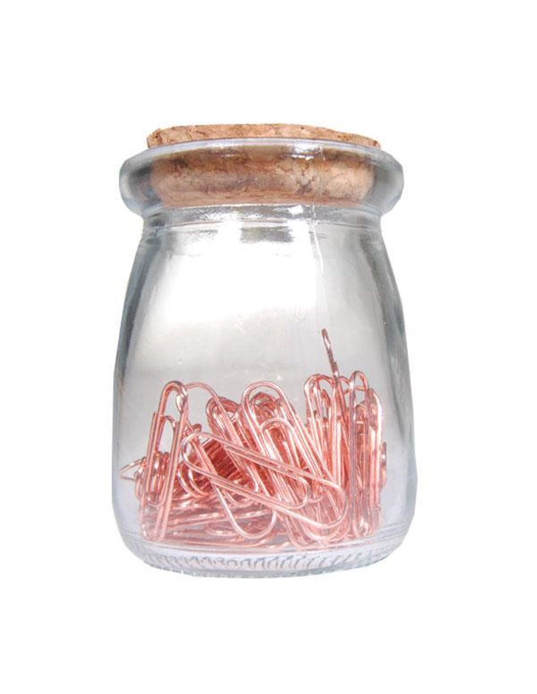Συνδετήρες ροζ χρυσό 2,8εκ. 100 τεμάχια σε όμορφο γυάλινο βάζο με καπάκι από φελλό. Ιδανικό για το γραφείο ή τη δουλειά σας. Δεν καταστρέφει τα έγγραφα. Διαστάσεις: Υ7,5xØ5εκ.
