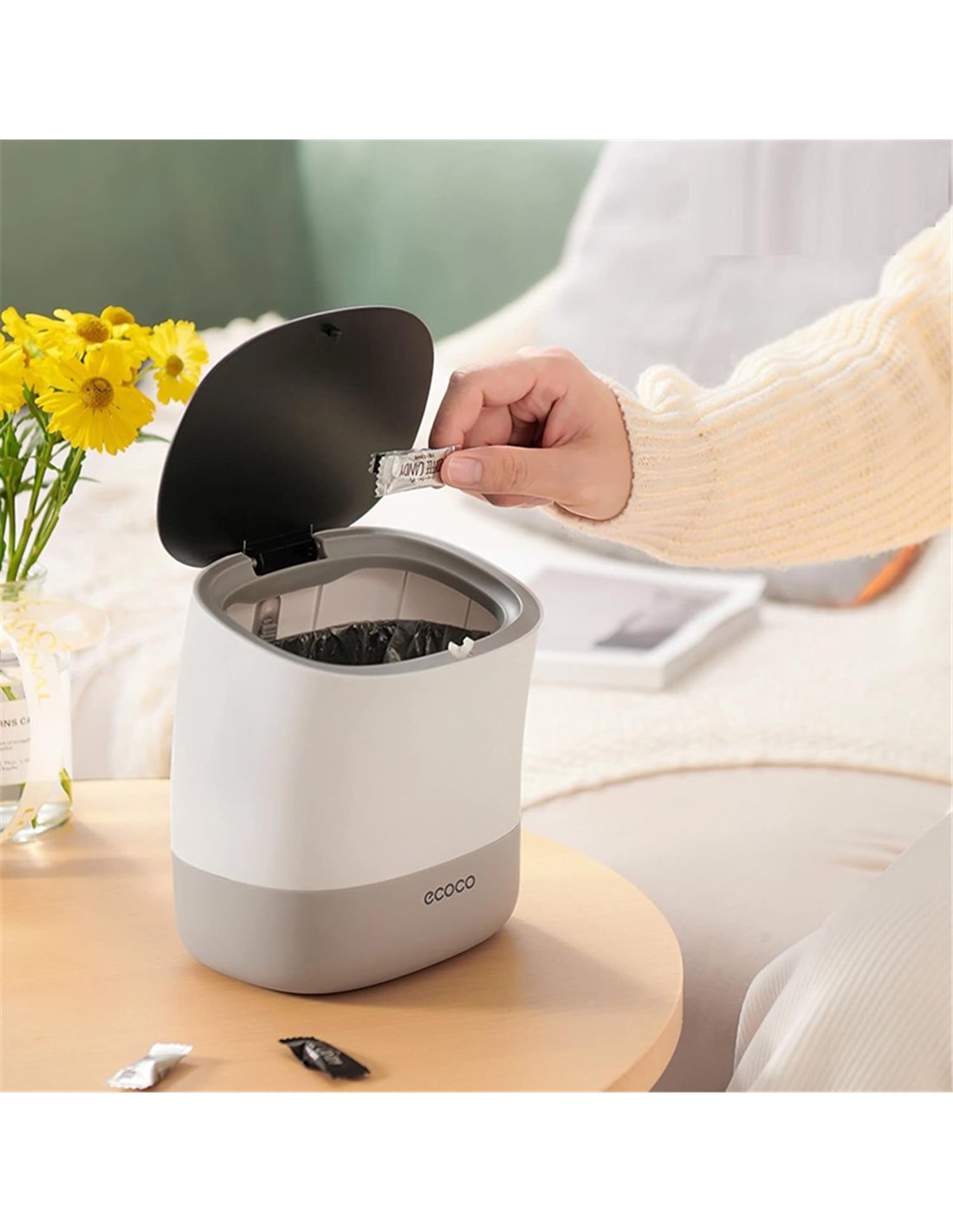 Μίνι επιτραπέζιος κάδος απορριμμάτων με χωρητικότητα 1.5 λίτρα από την ECOCO. Το πάνω μέρος του με το καπάκι αποσπάται από τον κάδο διευκολύνοντας με αυτό τον τρόπο την τοποθέτηση της σακούλας. Ανοίγει εύκολα, πιέζοντας με το δάχτυλο σας το καπάκι προς τα κάτω.
