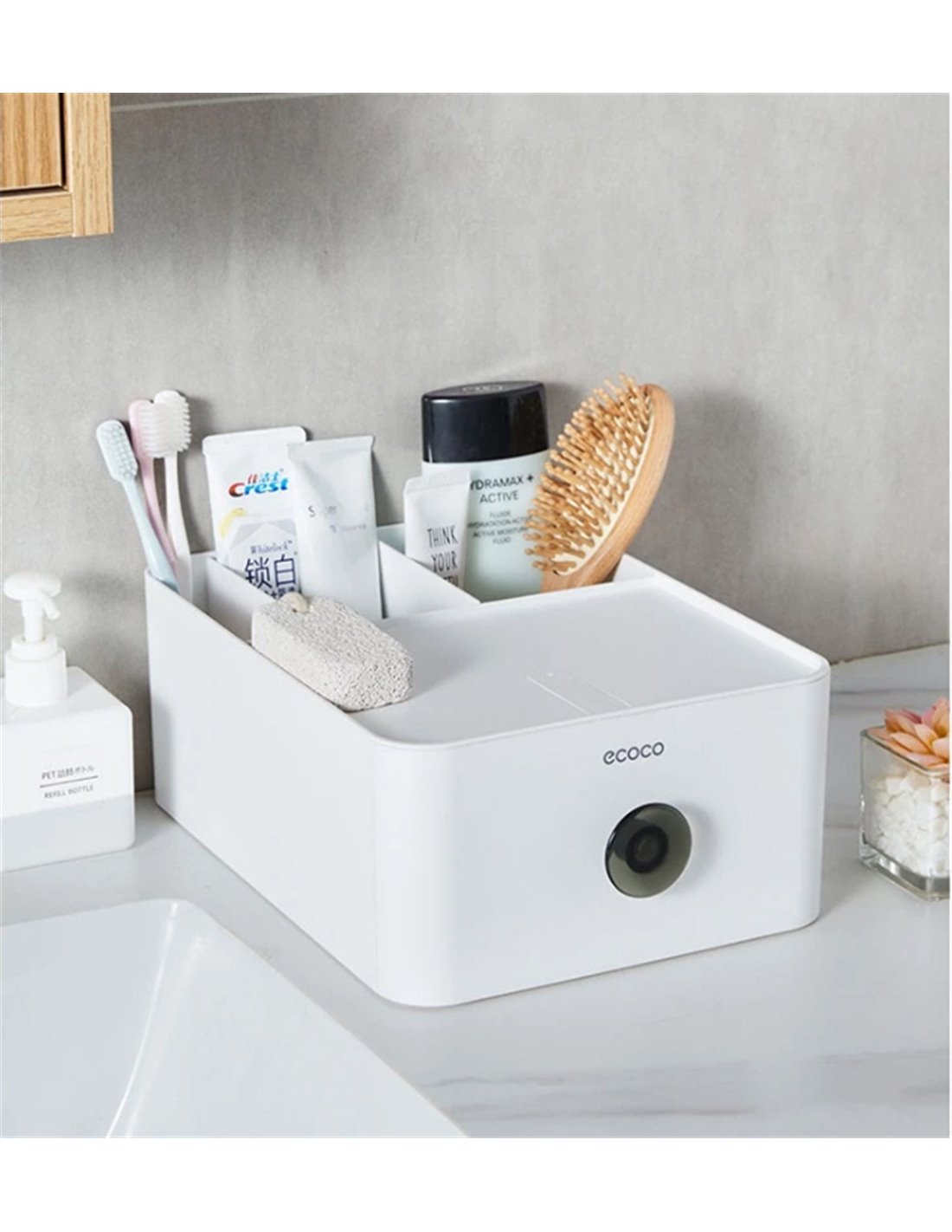 Πολυχρηστική θήκη οργάνωσης αντικειμένων της ECOCO. Εξοπλίζεται με συρτάρι, stand για smartphone και 3 ανοιχτά διαμερίσματα αποθήκευσης τα οποία μπορούν να προσαρμοστούν ανάλογα με τις ανάγκες σας, καθώς τα διαχωριστικά τους είναι μετακινούμενα και αφαιρούμενα.
