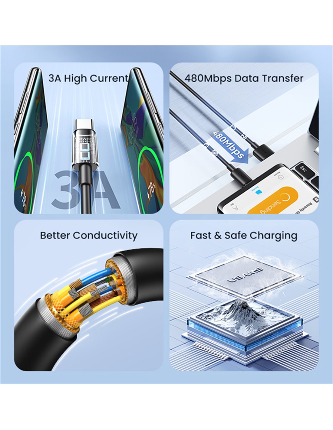 Καλώδιο φόρτισης και μεταφοράς δεδομένων USB-C σε USB της Usams. Υποστηρίζει φόρτιση με απόδοση έως 3A και μεταφορά δεδομένων με ταχύτητα έως 480Mbps.