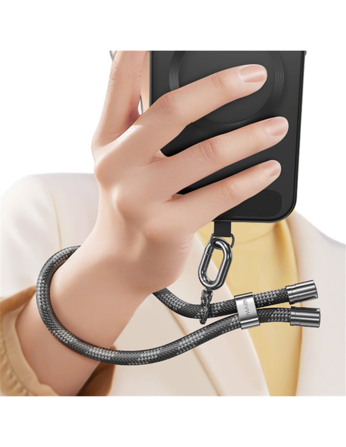 Είναι ρυθμιζόμενο και αποτελείται από 2 μέρη, το κορδόνι και ένα υφασμάτινο κομμάτι το οποίο τοποθετείται στο εσωτερικό της θήκης του κινητού, επιτρέποντας το κρέμασμα του από τον γάντζο του κορδονιού.